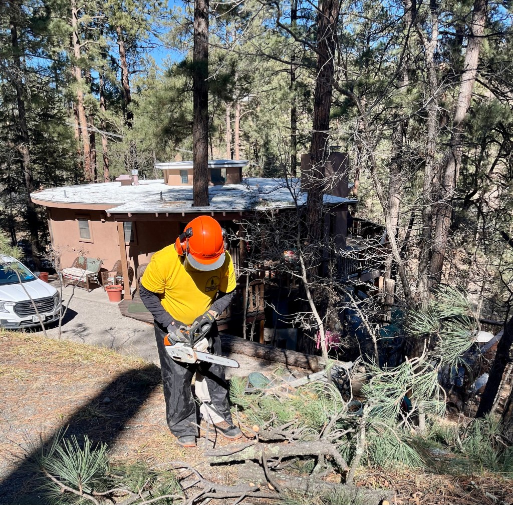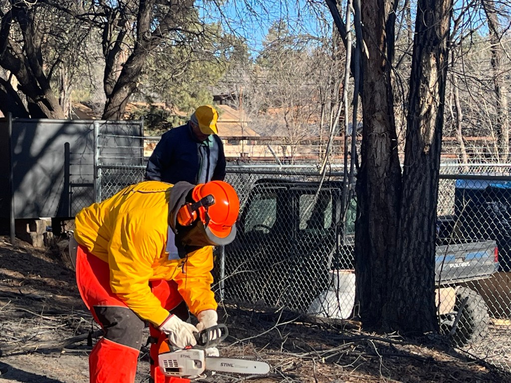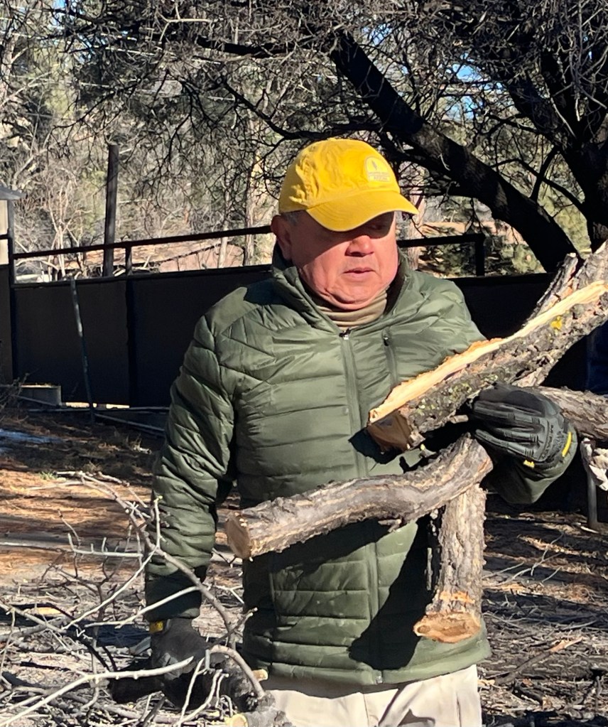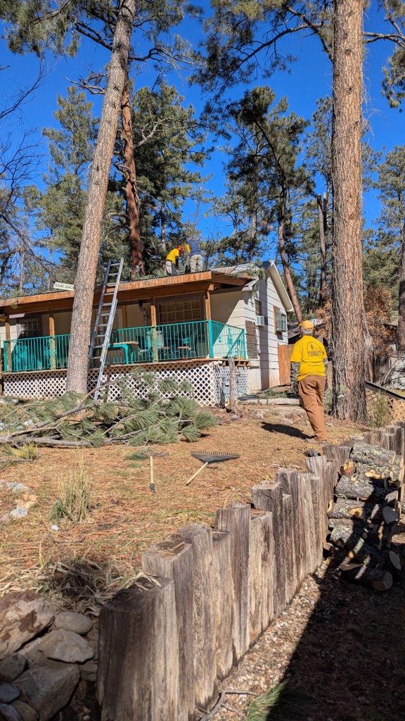 Who knew…DR Diana and DR Michelle are getting their steps in by walking trees and brush to the curb…The chainsaw work just keeps coming…DR Mike from Tucson hauling brush to stay warm…Roof work Mike about to whack some trees…Our team with home owners David and Sonia…