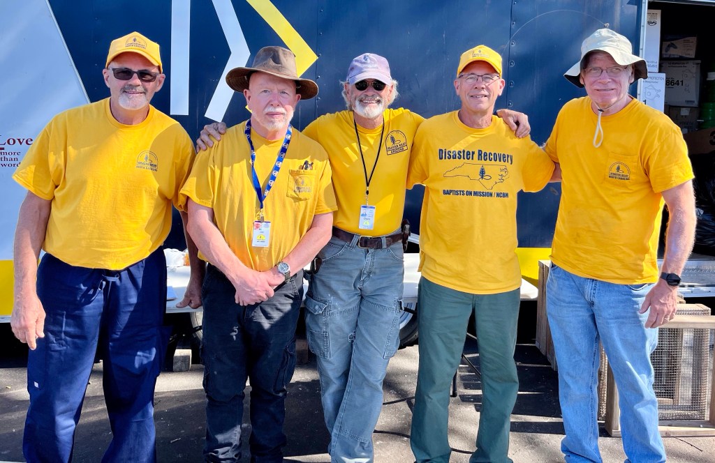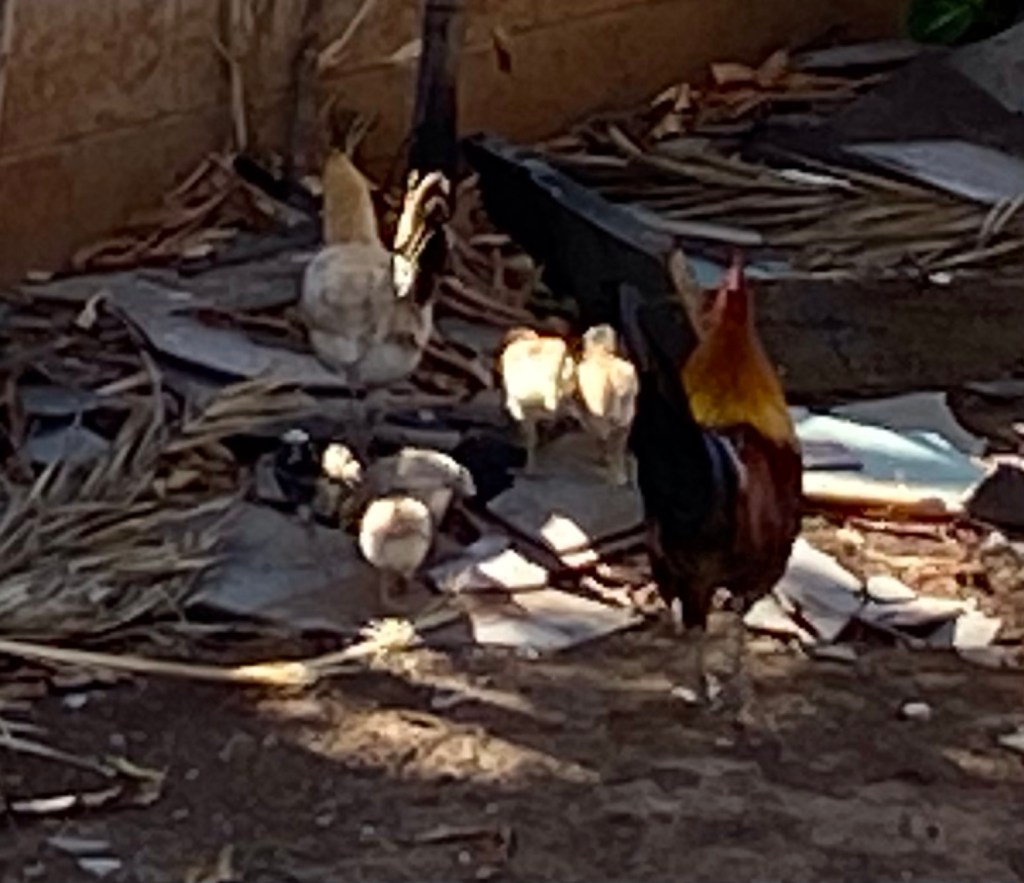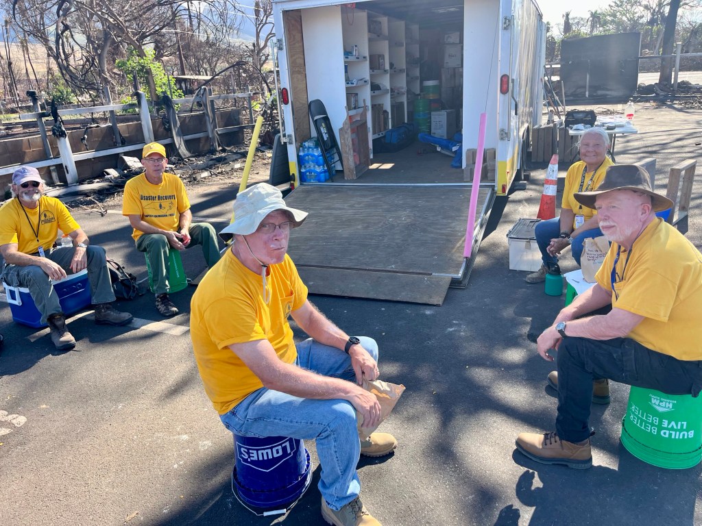 I have the greatest time serving with my all North Carolina team. From left to right, David, Joel, some Arizona guy, Mike and Jim. They did a trailer inventory for Hawaii Baptist, went to serve another Lahaina resident and generally looked good. We are the “A” team. I am pretty sure we are John’s favorites…Did I mention that it is hard work doing inventory? This shot has our team Chaplain in it. She makes the rest of us look good…Instead of selfies, we have chickens…I have no words…
