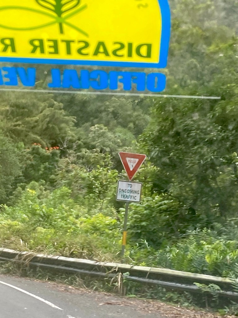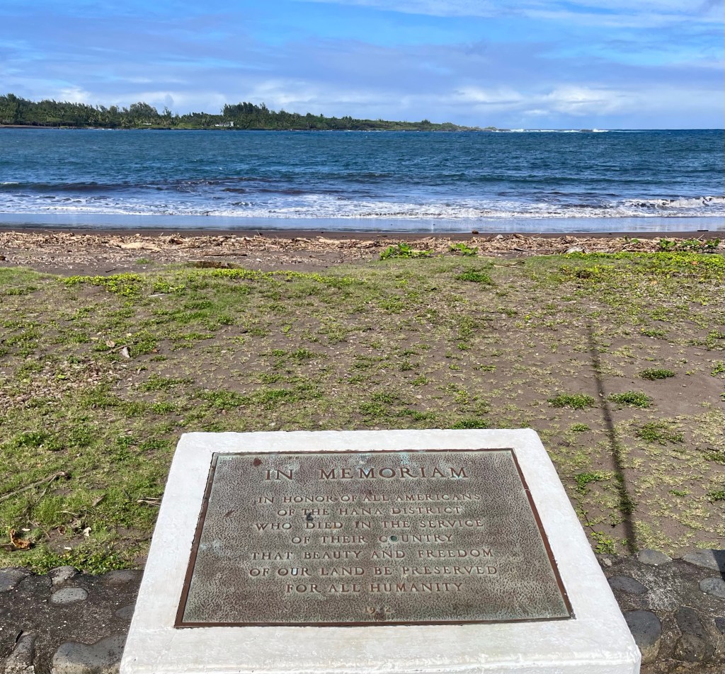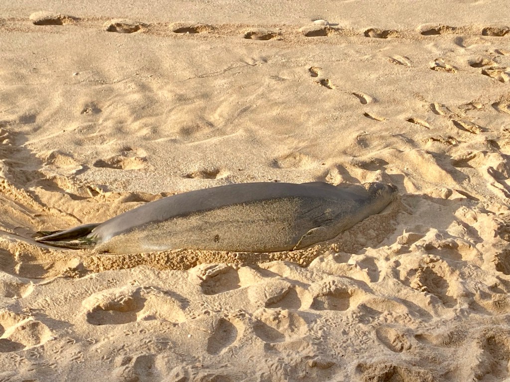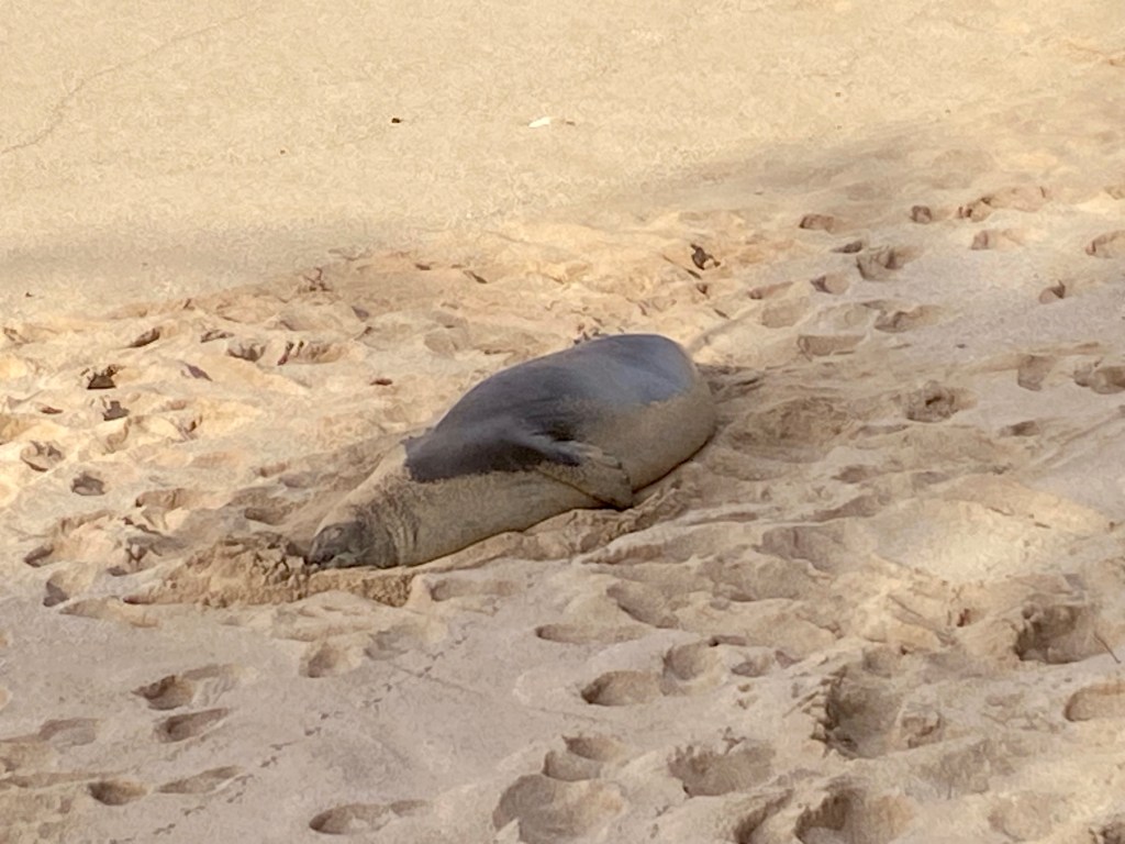 We really enjoyed our service in Kahului Union Church….We ran into our old friend Oreo this morning…Norm found these old boat parts at our visit to Baldwin Beach Park. She wanted to take a piece, but they were too heavy for her to pickup…We drove the Hana Highway, around thirty miles in length. We counted 55 of these one way roads, or one lane bridges…Most of the road looked a lot like this….Hana Bay…We stopped at Kaumahina State Wayside and I could only find parking for three of my tires. Not sure how this happened…A Monk Seal taking a siesta brought quite a lot of attention. Other than raising his head and opening his eyes, he didn’t do much…He did do a 180 but we missed it, as there were a lot of turtles near by…