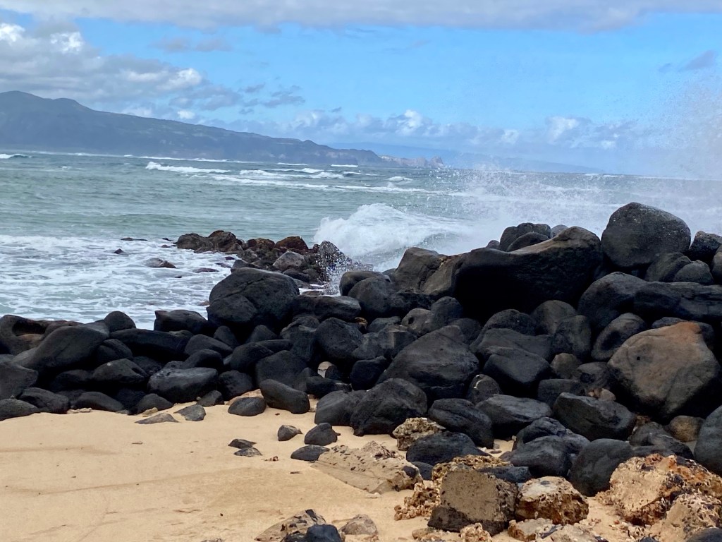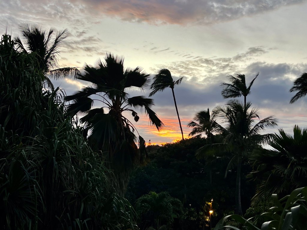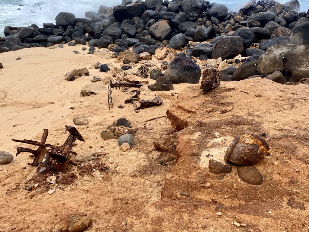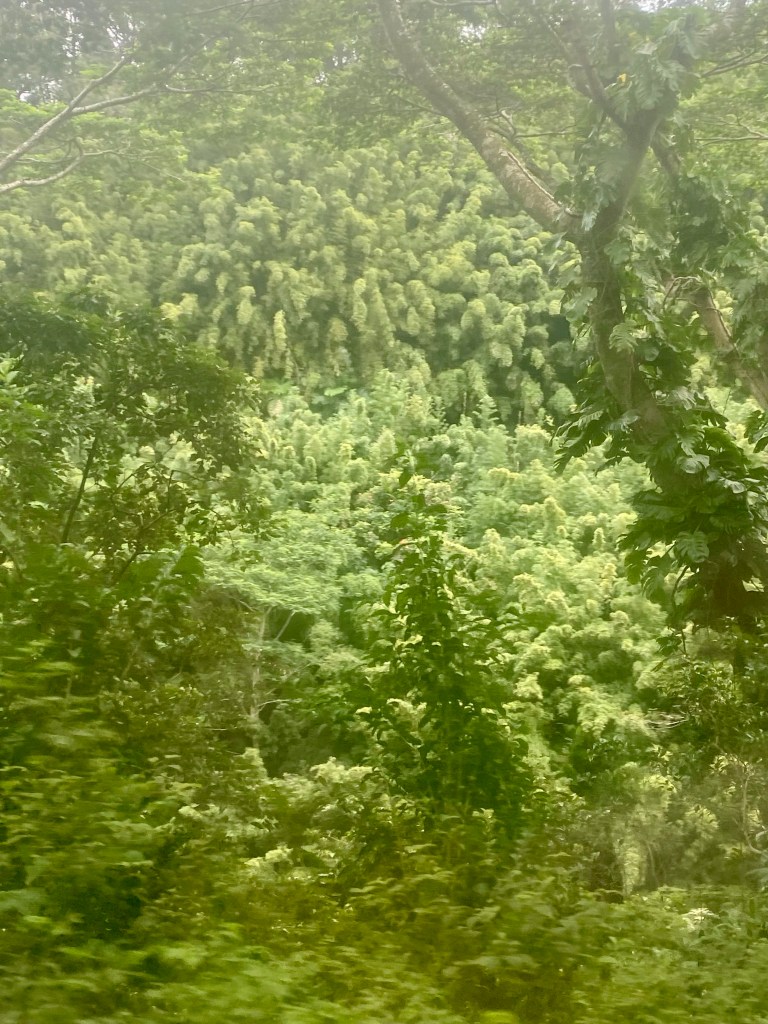We really enjoyed our service in Kahului Union Church….We ran into our old friend Oreo this morning…Norm found these old boat parts at our visit to Baldwin Beach Park. She wanted to take a piece, but they were too heavy for her to pickup…We drove the Hana Highway, around thirty miles in length. We counted 55 of these one way roads, or one lane bridges…Most of the road looked a lot like this….Hana Bay…We stopped at Kaumahina State Wayside and I could only find parking for three of my tires. Not sure how this happened…A Monk Seal taking a siesta brought quite a lot of attention. Other than raising his head and opening his eyes, he didn’t do much…He did do a 180 but we missed it, as there were a lot of turtles near by…