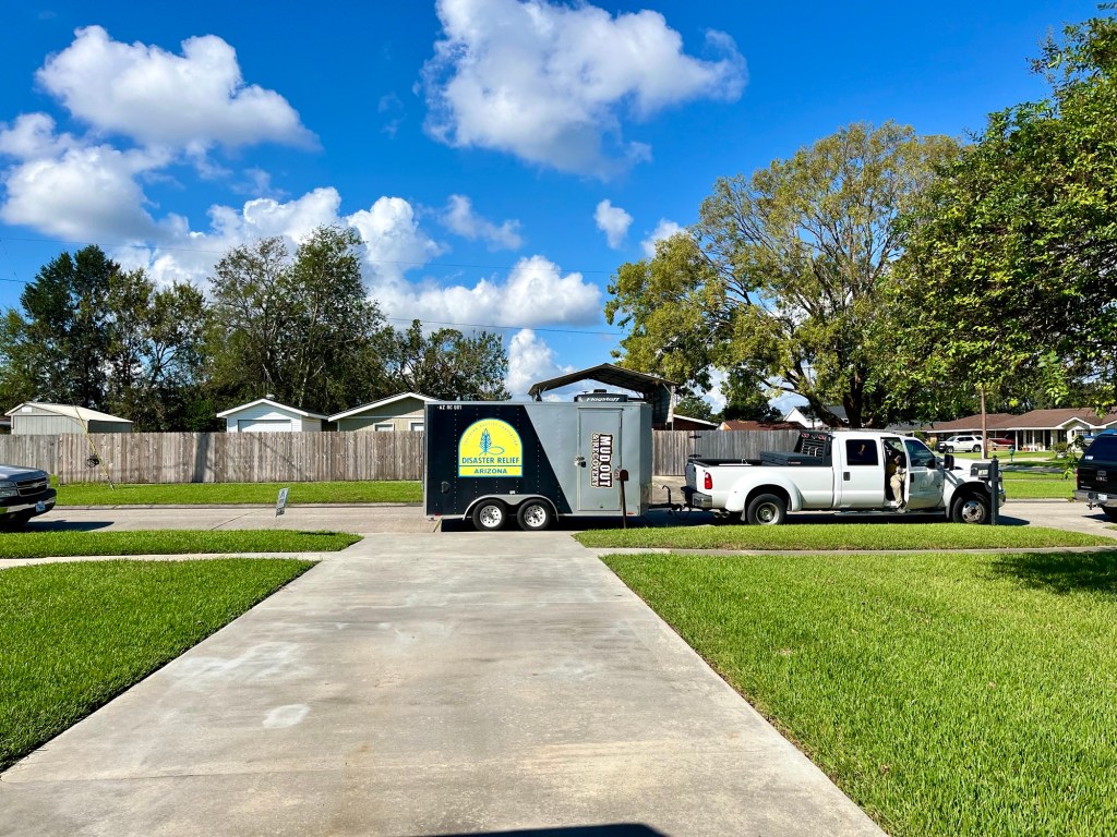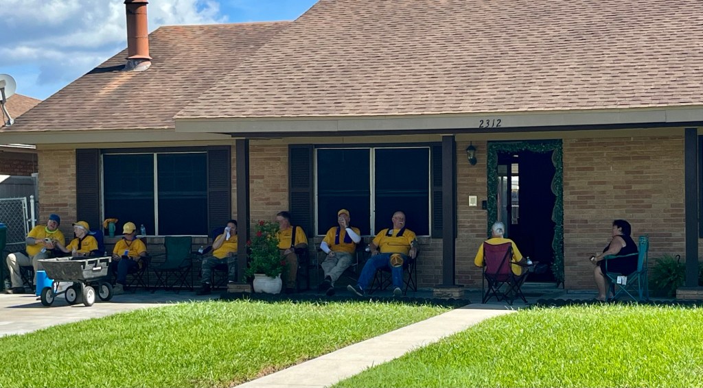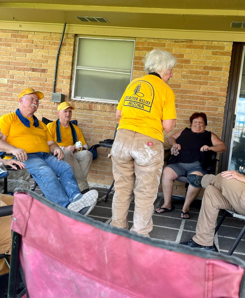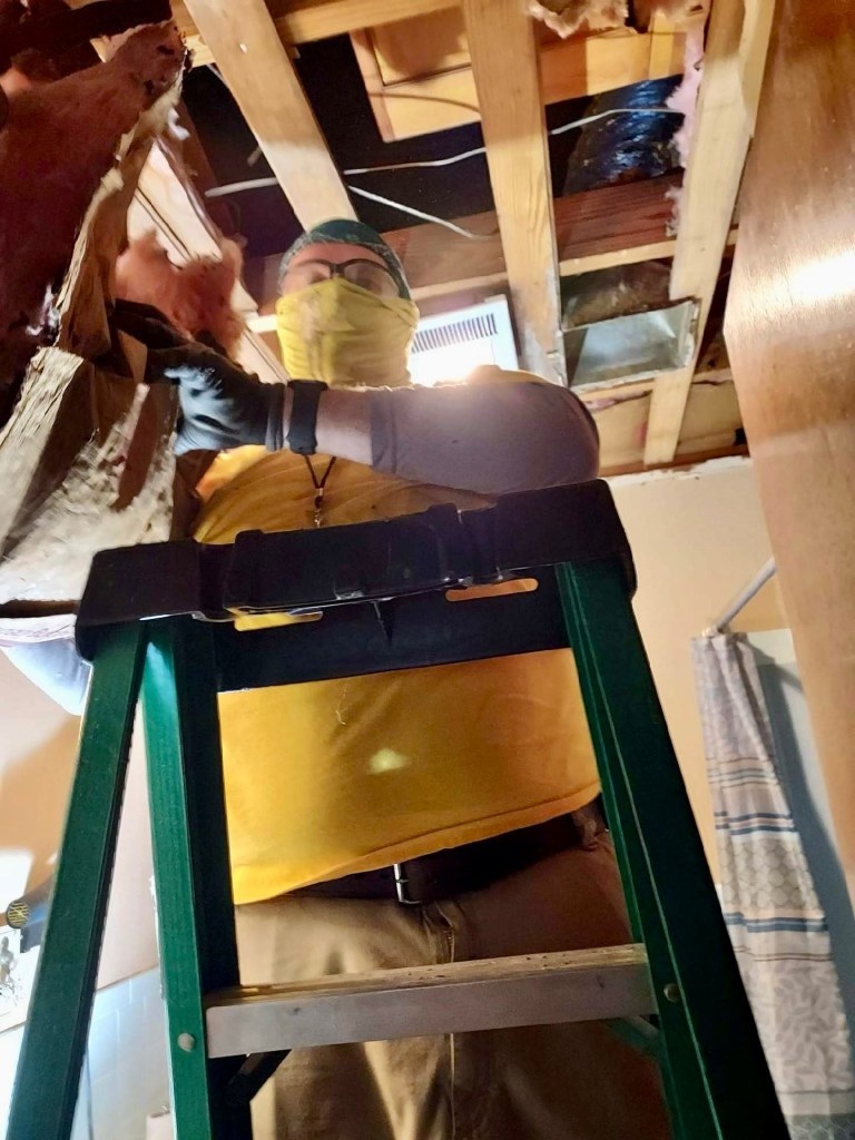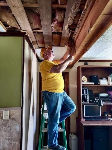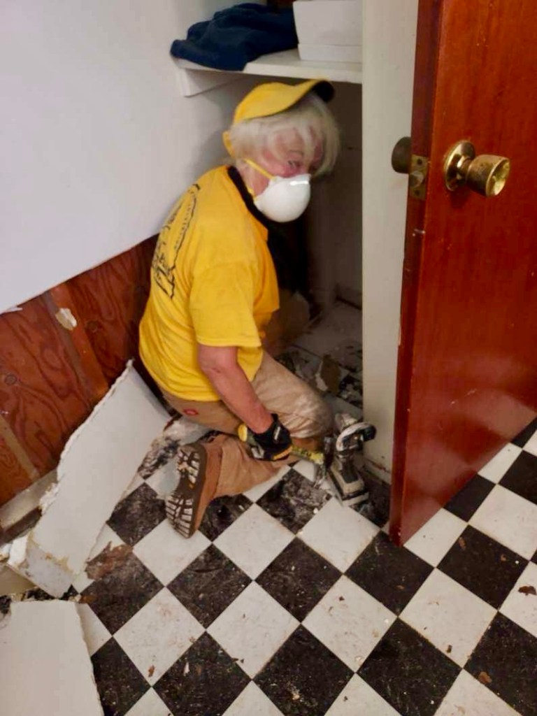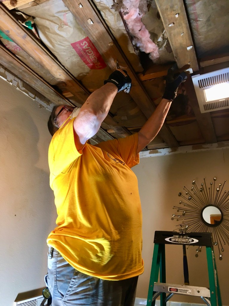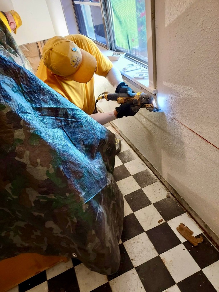 Our first job was canceled, so we headed to our second job for the day. We are a big crew and take up a lot of space on breaks…The ceiling in one of the bathrooms had to come down, so DR Theresa went to work…DR Mark took care of the living room ceiling that also leaked during the hurricane…After some deliberation it was determined that the trim and drywall had to come out…DR Brad took the lead on precision cuts to remove the mold…DR Robbie assisted in the living room…DR Fran is small in stature, but big in heart and ability. Our Blue cap puts her in the tight spots…What can I say???…
