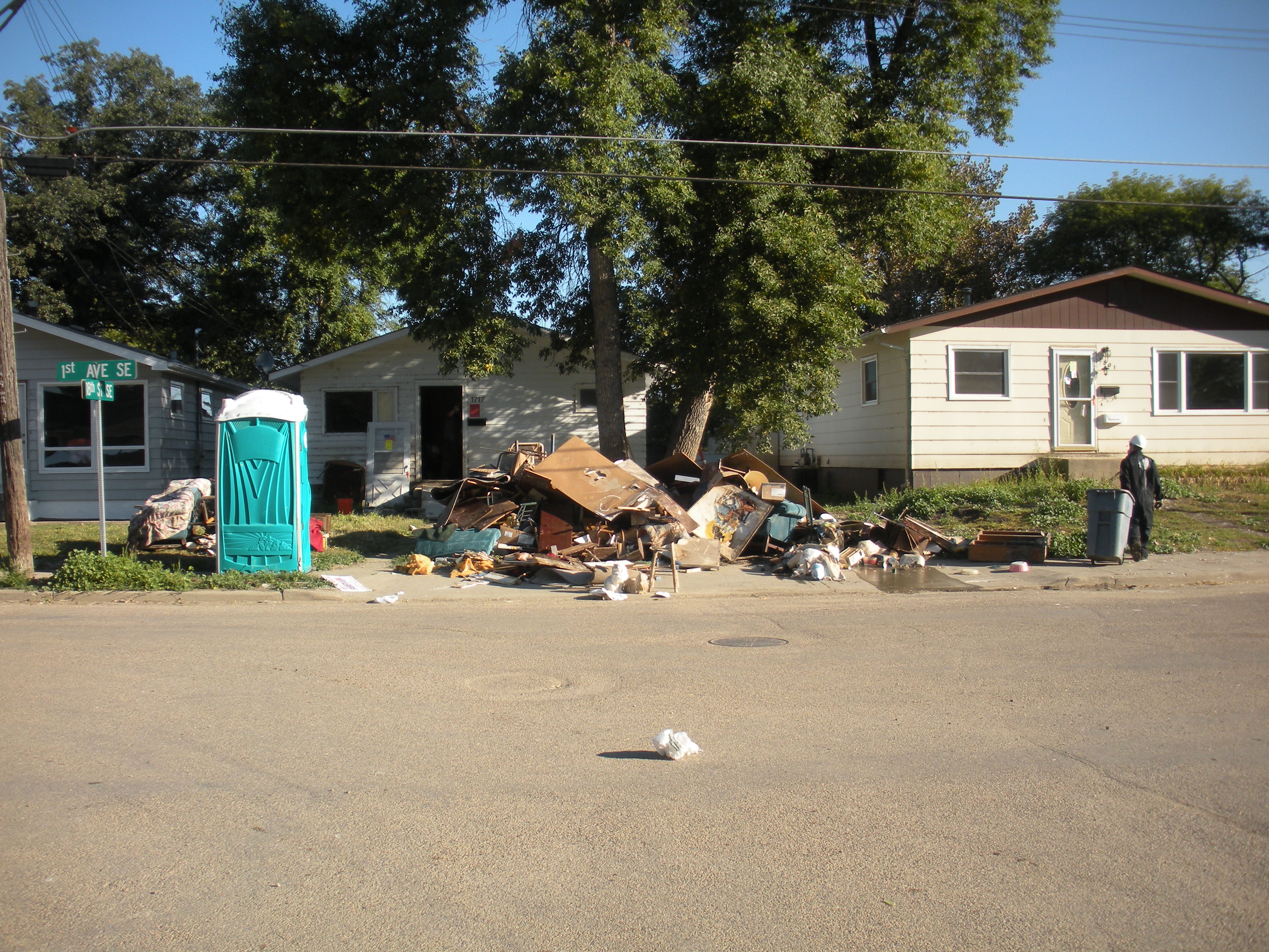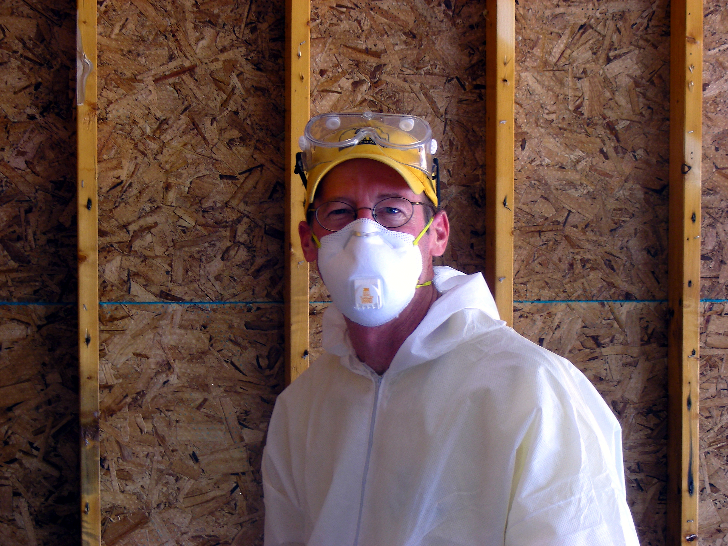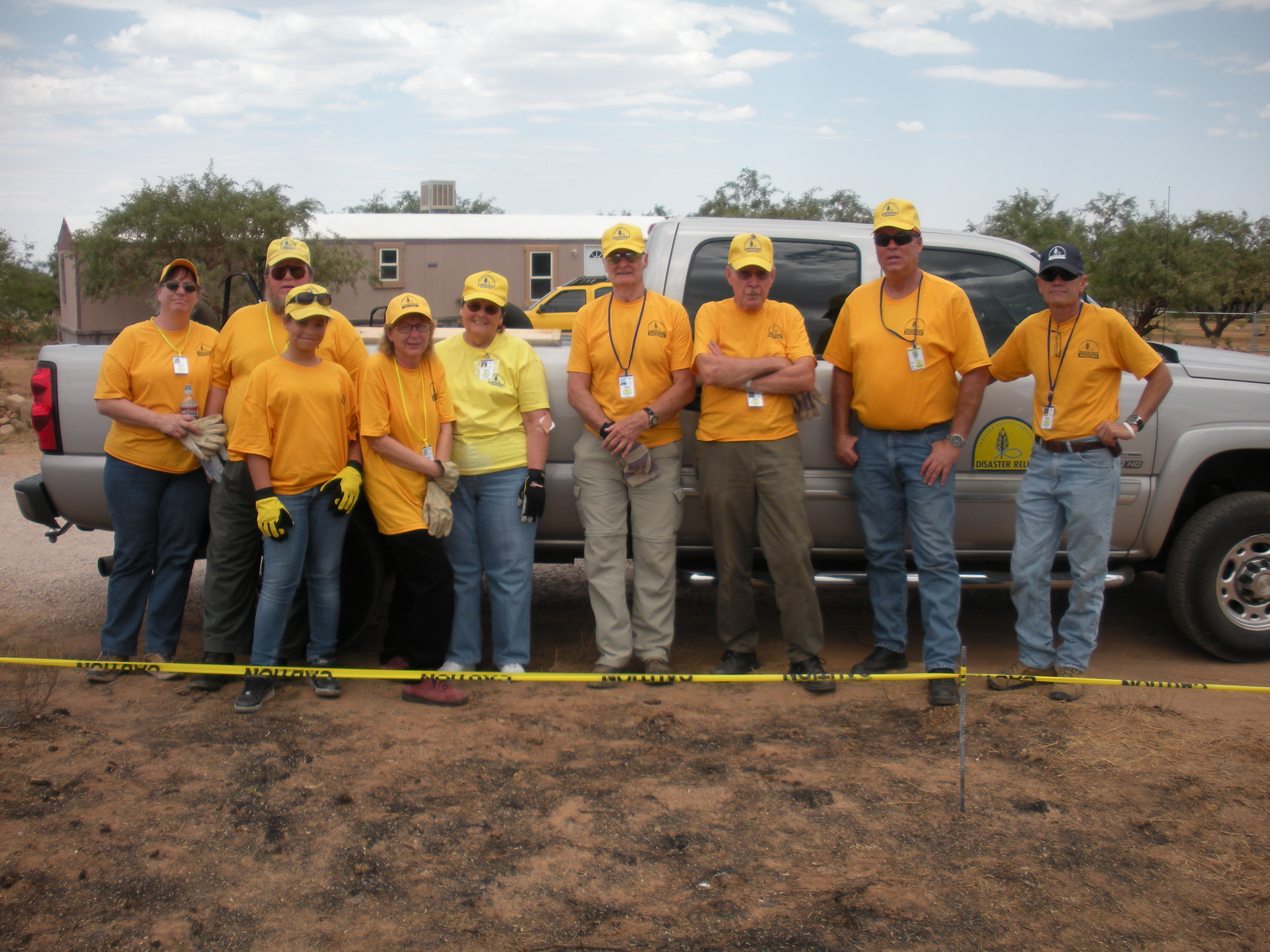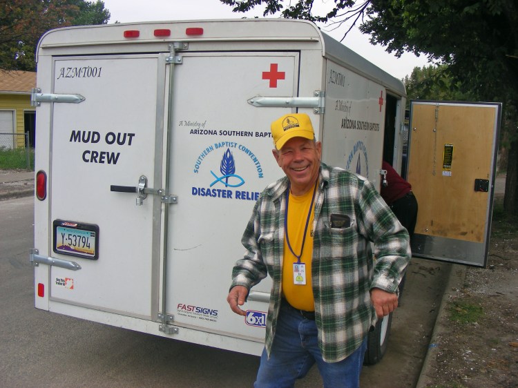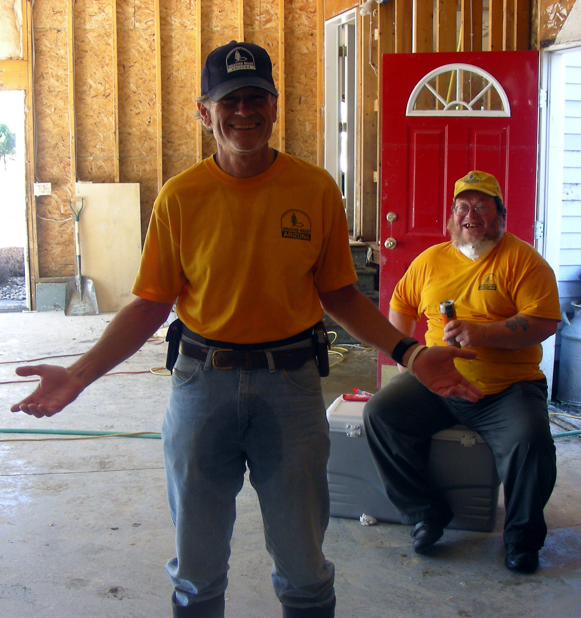 This is Ed, a Pastor from Bisbee on his second call out with me. I first met Ed in Sierra Vista working the fires there and took an instant liking to him. I really like his down home style and can’t wait to visit his church to hear him preach someday. Ed gave the morning devotion at breakfast a few days ago and that allowed me a preview of what I have to look forward to. We had to split up yesterday for lunch. It was Sunday so we attended services here at the Lutheran church that is putting us up and worked a half day, almost completing the home we are currently cleaning. Ed and I were left behind and kept washing and spraying, but when it was our turn, we tried to put a hurting on the pizza buffet table where we ate. Ed’s a newlywed and we have to thank his wife Louise for letting him help us on this trip. The second reason I was glad to see Ed is because he was standing there with a large bottle of home made salsa in his hand and a smile on his face.