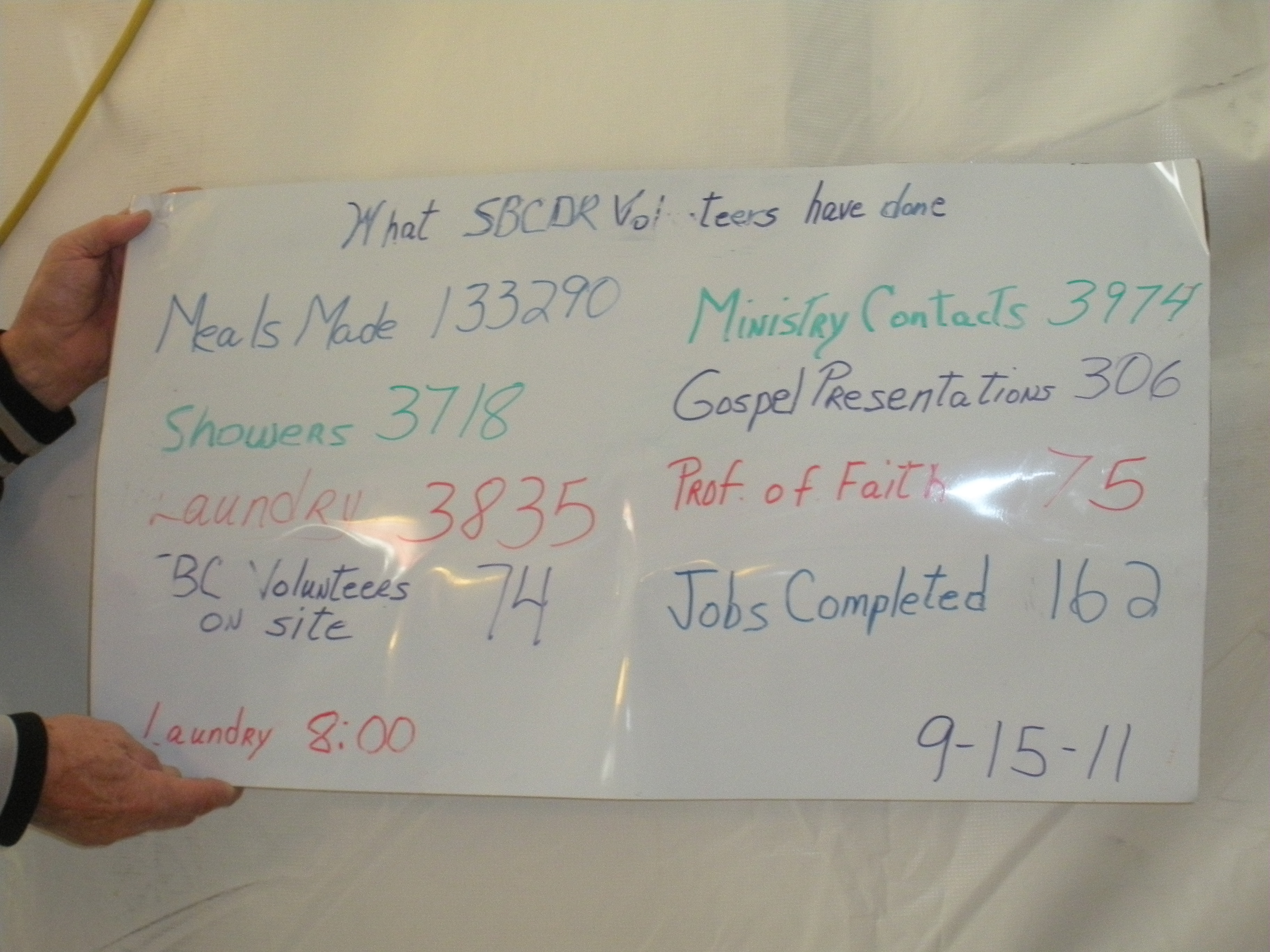 This is how I have felt since hitting the ground running in this thriving town. Our team has hit the good homes of Minot with our pressure washer and sprayers washing and spraying every house we have been assigned (all but one really). Things have really been looking up on this trip compared to my last visit here back in July. I liked the weather better in July (mid-eighties) as to 29 degrees just two days ago. I have been cold since I have been here and standing under the pressure washer spraying the basement rafters does not help much. The food has improved dramatically and we now have Tabasco (of which I have a new found love of) on every table. We feel a sense of urgency to help complete the few remaining jobs. I say few, there are 64 or so homes still remaining and we are racing the weather and the shut down of the entire operation by the end of this month. Teams from Colorado, Tennessee (we are bunking in the same church and they are always on our case for working half-days, they just don’t understand how technical our work is), Michigan, Minnesota/Wisconsin, Texas, Georgia, Illinois and Kansas/Nebraska. The Lord has been blessing us and has been with our every step! Thanks for praying for us and I will try to do a better job on my updates. I am still trying to get my emails back from bad people trying to take advantage of all our friends and family.