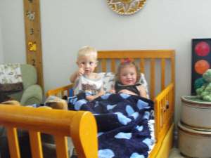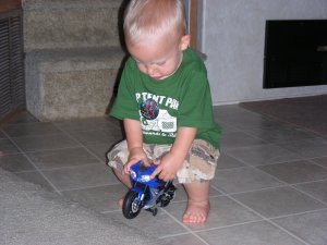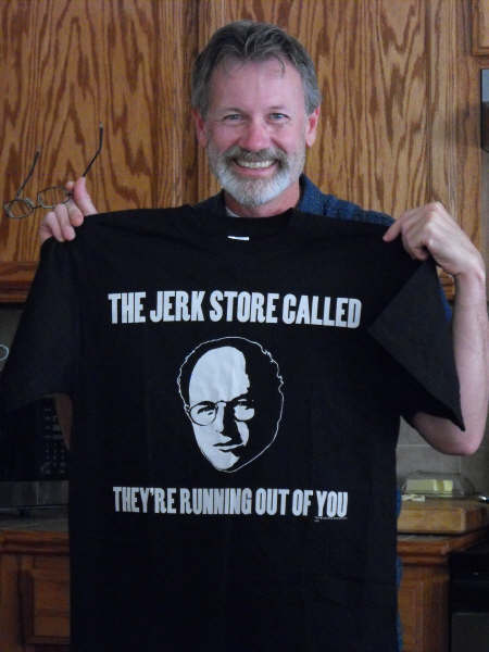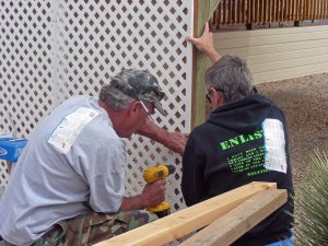 I did some day labor work today helping my Father-in-law with an outside project. Here I am helping my Brother-in-law, Jeff, and as you can see, we are both working hard (really all I did was hold things). It never seems to fail though, when some men are working hard, some women (Norm) are fooling around. Jeff would have driven off to work in Flagstaff with the sticker on his shirt, if I wouldn’t have told him.