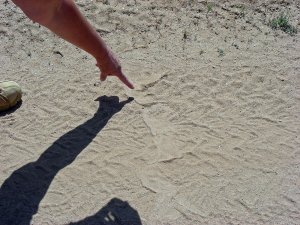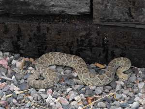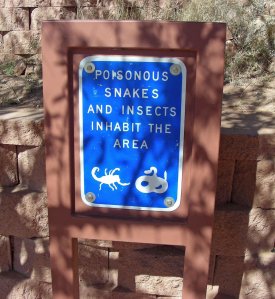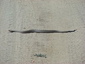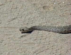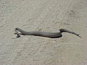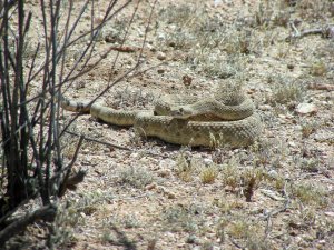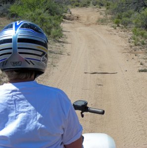 This is the second time in about three years that a rattlesnake has struck out at Norm as she was riding her quad down the trail. The first time the snake took a swipe and than crawled quickly off the trail into the bush, but not this one. This snake is bigger than the one we encountered last and had a bad attitude toward trail riders. There seems to be a large crop of reptiles in our desert this year. We have been riding and hiking through this area since 1998 and have never seen this many rattlesnakes. They are also very close to the park. The other thing that surprised us was how loud his rattle was. You could easily hear it from quite a distance. Not only do you have to watch where you walk, but, where you ride!
