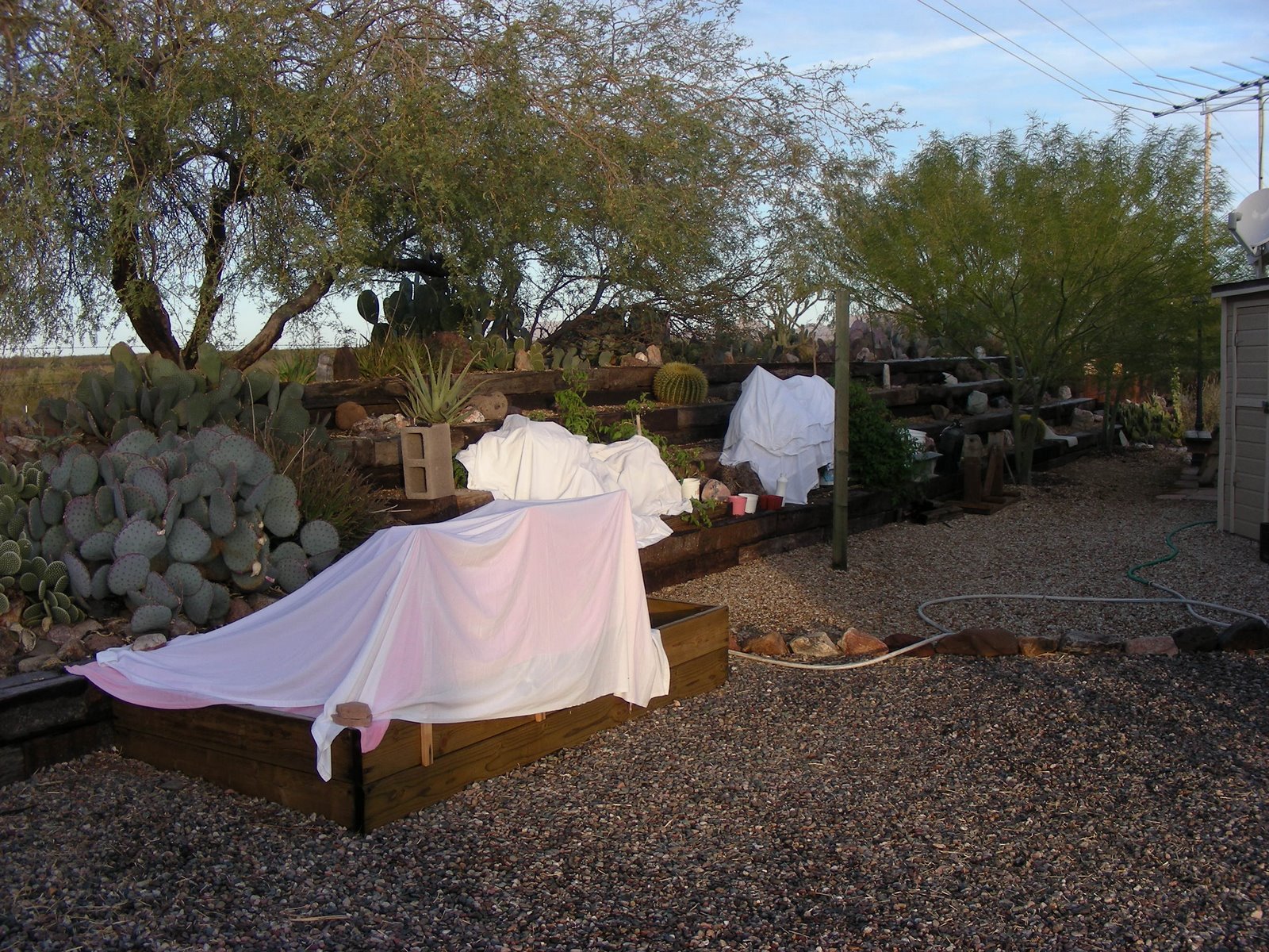 “Location, location, location!” I hear that is said a lot in real estate. This is a shot of the neighbors (Norm’s parents) yard. This must be done to keep tomato plants from freezing. I thought we lived in the desert? You can call it an eye sore if you want, but the veggies all taste really good.