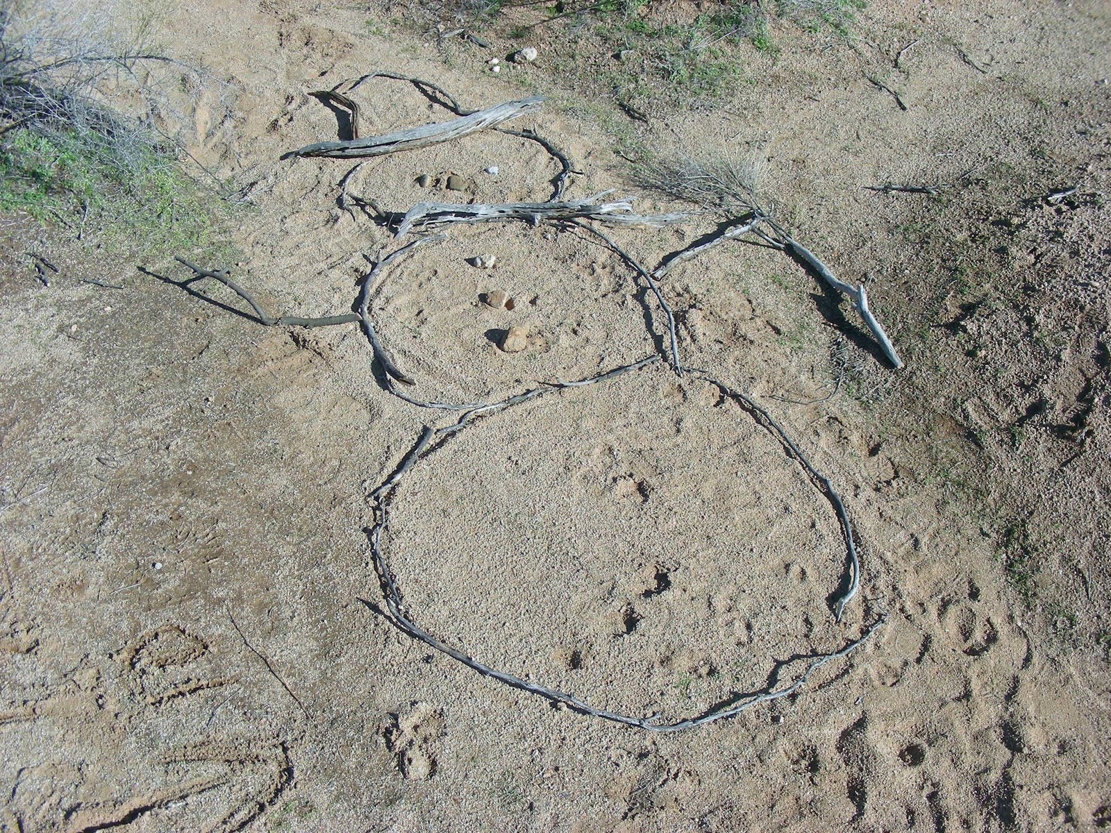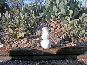 Only in the desert? No, it did not snow here, this snow is from Arizona, from Flagstaff. The two responsible for Mr. Snowman are seen above, Leo the little and his great uncle Jeff. The snowman came ready to assemble, minus his two eyes. The finished Mr. Snowman below stood proudly for about an hour.
