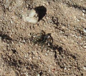 Two to three times a week Norm and I take a walk in the desert. We each carry two bottles of water, some survival gear and travel around three and half miles in a little over an hour. The terrain is split between level and hilly. Every time we go for months now, we have checked to see that one of us got the camera. We have it with us to take a picture of wild life. After two and half months, this is our only shot of wild life. Our hope was for a close up a jack rabbit (way too fast to shoot), a mule deer, or maybe a javelina. We even saw this guy (we think he is the same one) in the same spot for two different times till we finally stopped to take his picture. He did not want to cooperate so Norm used a stick to stop his forward progress. This did not make him happy. So I worked quickly and this is the best I could do. He is all fuzzy with a bad disposition, especially when confronted with a stick.