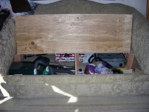 . None of which we used. I have to give all the credit to my Father-in -law for the final design and how well it works. All of my ideas were kind of crude and goofy. The best part for me, Norm is very happy with the new storage, and that is very good for me. Second best is getting half of the vacuum out of my side of the closet. The other half was in Norm’s side, she’s happy, now there’s more room for shoes. Last, but just as good, is the weight savings of venting the insides of the sofa bed. We set it out next to the road with a free sign hoping someone would take it, but that was a no go. We decided to keep the mattress for a future home improvement, but we will have to pay to take the remains to their final resting place (the dump).