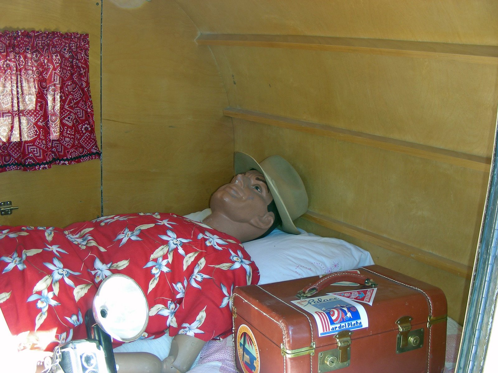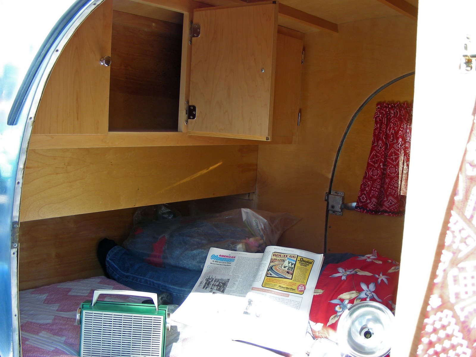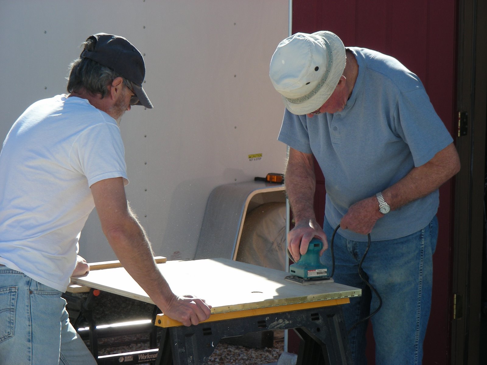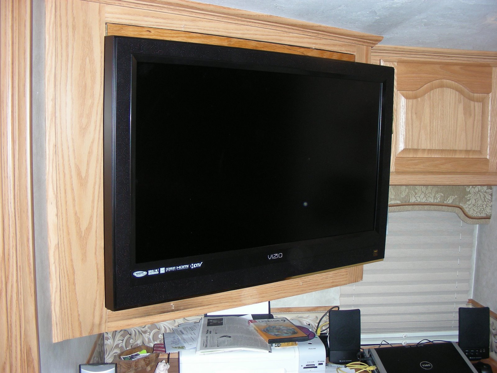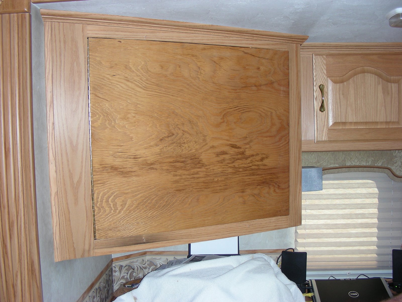 We had to get a new TV before the DTV dead line. I know, we did not really have to get one, we just wanted one. A couple of reasons we went with a new TV, first the old one weighed a ton, and second we wanted to make another place for Norm to put stuff (hopefully not shoes). Again, this is another project that I would have liked to have been my idea, but of course it is not. I first read about this in Trailer Life magazine, small article with not much detail. There is a NuWA owners web site that I frequent to check on what other RVer’s have go wrong with their Hitch-Hiker model. A fellow 29.5 owner published a very nice article complete with photo’s and details on up grading to a flat screen television and gaining some much needed cubbie space. After cutting three doors from a sheet of plywood and only needing one, we finally start work on this one. We have the hinge installed and my Father-in-law is doing a final sanding before applying some stain. I look like I am over seeing the operation, but I am just holding the door. The project went fairly smooth compared to most of my adventures of this type and we got a sweet deal on the TV from our number one salesman at Dell.com, our son. After some pushing and shoving, some grumbling, and someone (Norm) saying it was crooked, things turned out very well. The presentation is a huge difference from our old heavy weight model.