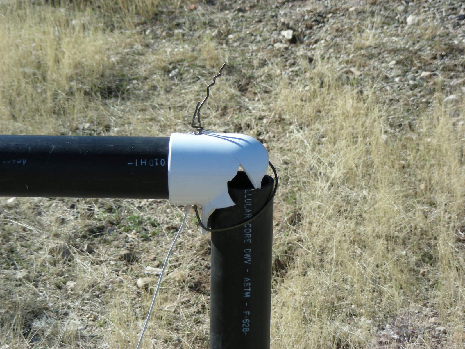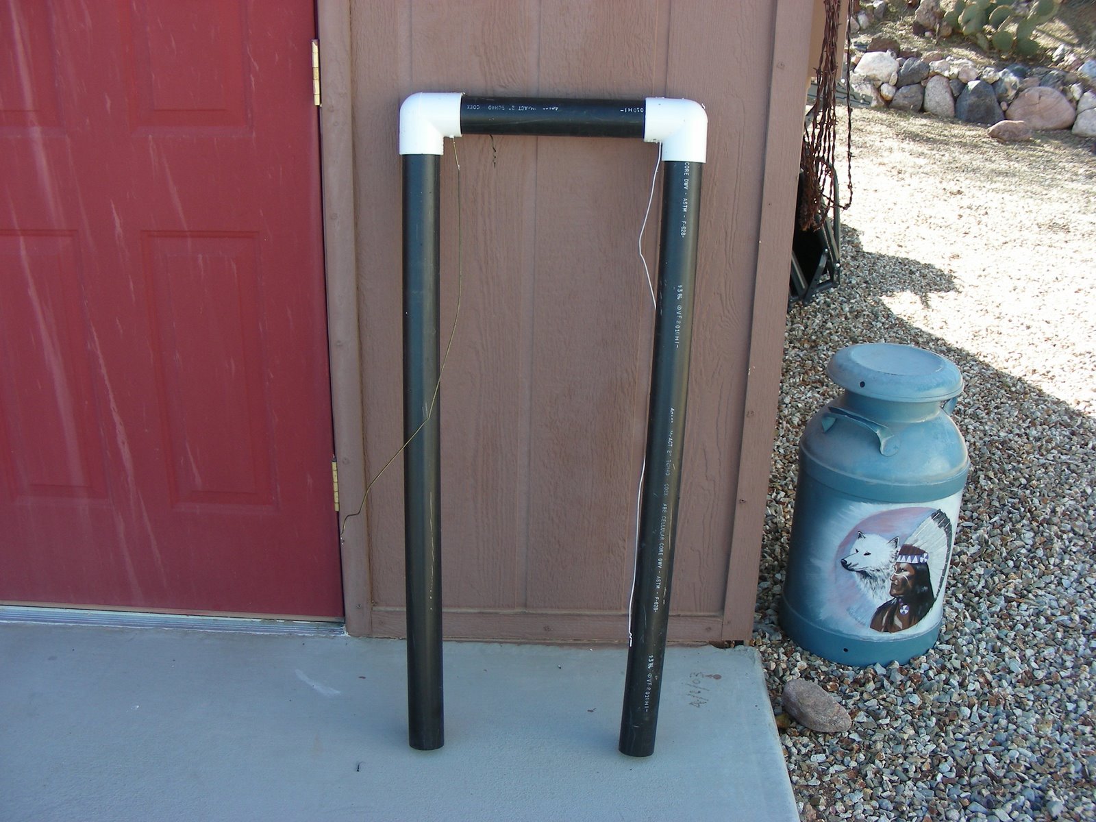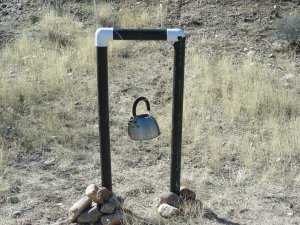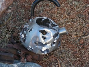 came across some free PVC pipe and for about five dollars, I made this crude looking target stand to practice shooting. For some reason, I thought it would be a good idea for Norm to learn how to shoot a pistol. So, we load up our machines and head out to our local desert for Norm to take her first shots and to try out my new target stand. I only had to wait for Norm’s second trigger squeeze of the day to see the flaw in my design. She blew the upper right elbow apart! For some reason, I had no duct tape, but I did have my Father-in-law with me and the two of us wired the frame back together, hooked our old tea pot back up and were ready to go”hot” in no time. Norm hit the pot a lot, and filled it with holes. At one point it had a face like image made from Norm. Now the tea pot has taken up a prominent spot in our desert junk yard display. Just have to wait for it to rust up now.