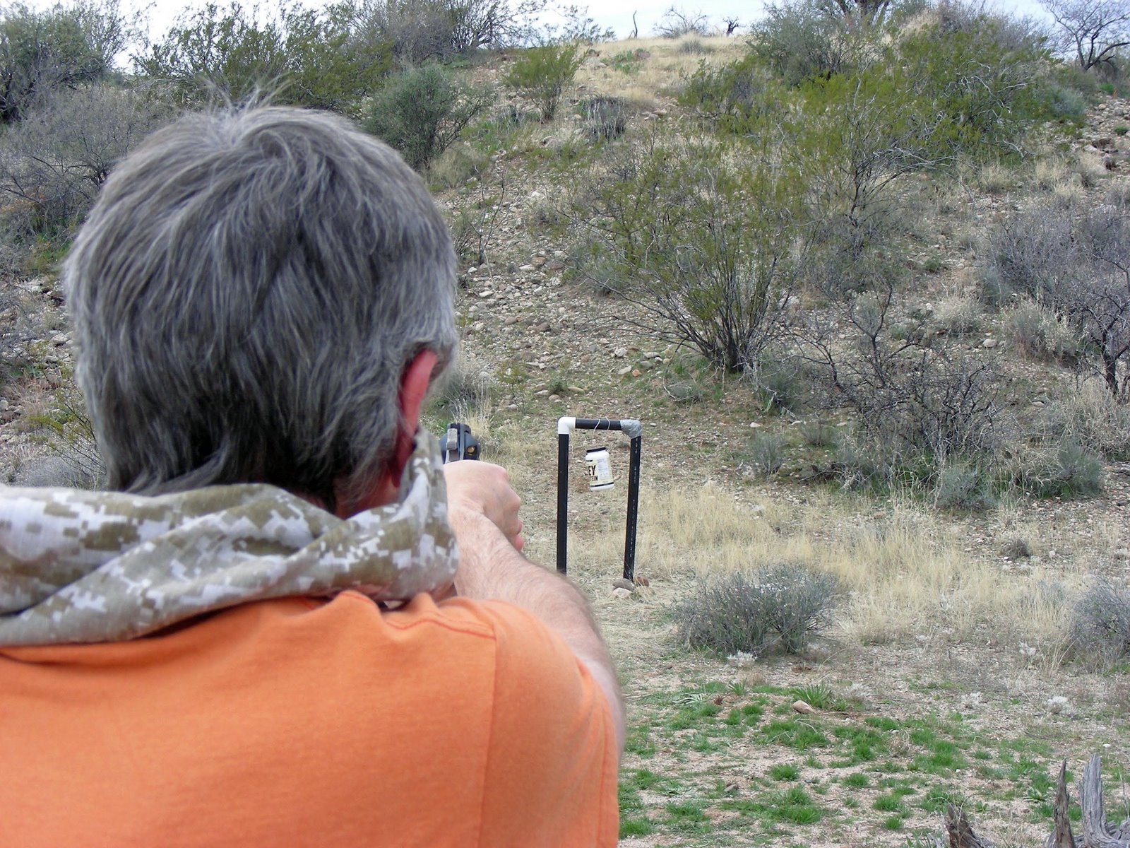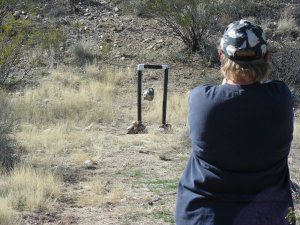 We love to go target shooting and I guess we are so excited about it, we always forget to take something. This day we were already on the trail to our target stand when I realized we had forgotten to take a target to shoot at. Turning around, going back home, and picking up some recycled products to put holes in, we finally arrived at the range only to find we had no ear protection. Norm, not only being a great shot, (at one point she hit eight of nine rounds) figured we could jam my camouflage handkerchief in our ears and still get some rounds down range. This emergency fix worked just fine and allowed us to have a great afternoon. If you look close, you can see the duct tape fix I used to improve our target stand. Norm is a much better shot now and did not blast the other white elbow to pieces (yet).