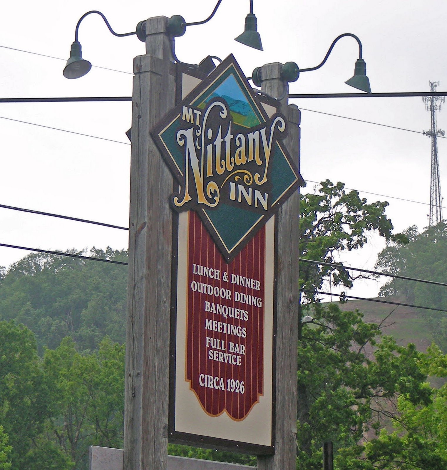 The Mt. Nittany Inn sits on top of a mountain in Centre Hall Pa. (small hill if you have ever been out west) elevation 1809 feet. I think since being located here the restaurant has burned down twice, the second time was during construction after the first fire. As you can see the view is great and we brought most of the customers the day we ate there.