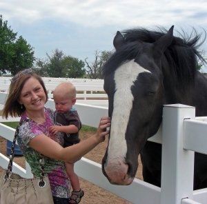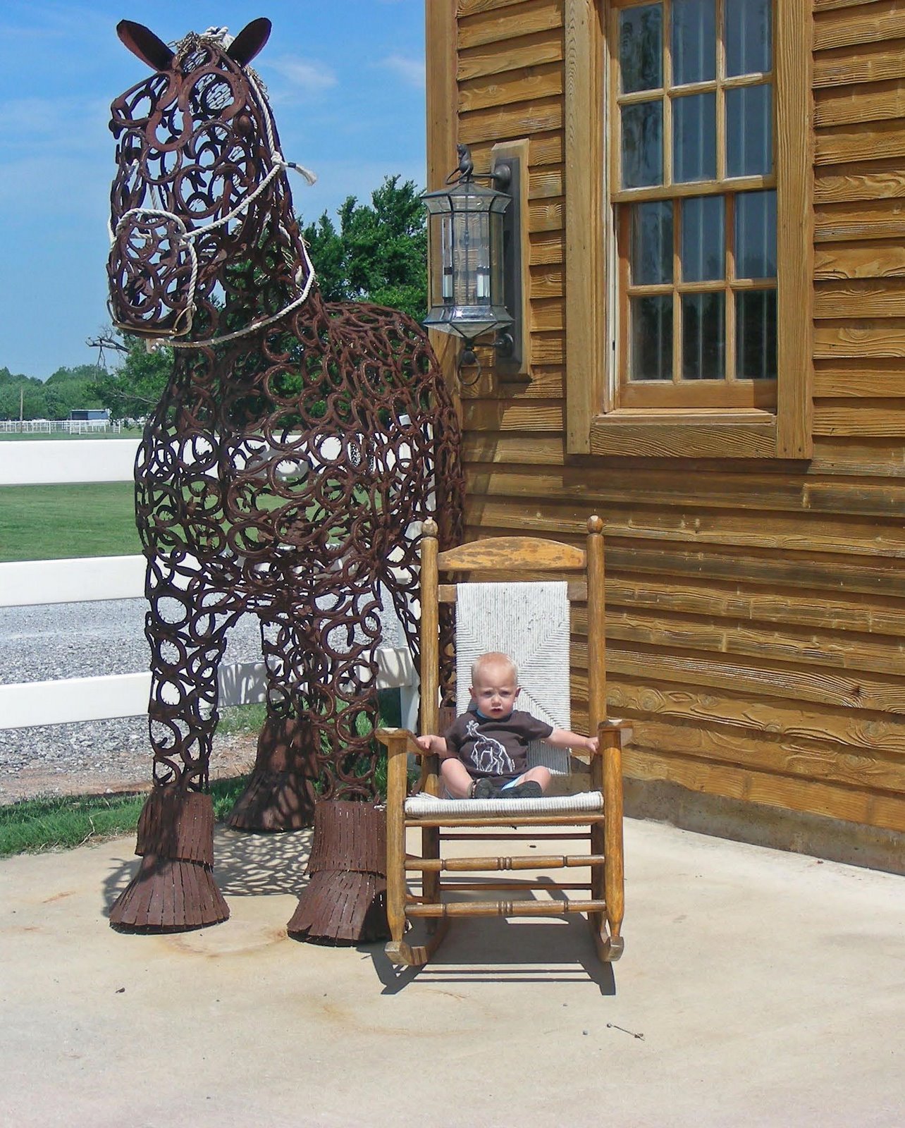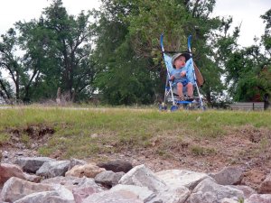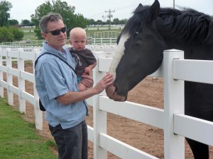 We visited the Express Ranch in Yukon, Oklahoma, located just north of Route 66. As soon as we arrive, Leo has to take a break from riding in his car seat to relax next to the barn.