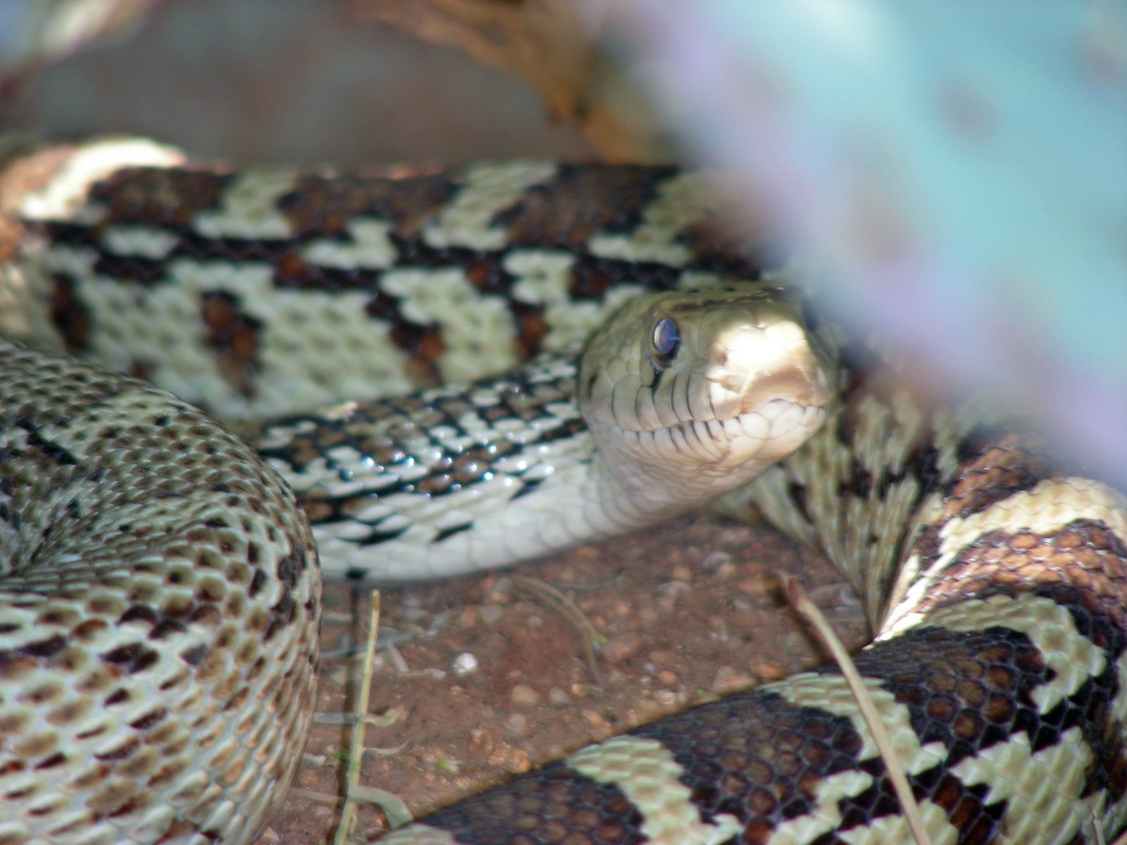 This guy was in our yard right by my feet as I was getting directions from Norm about cutting branches off our tree. The only reason I knew he was there, I heard him crawling around. I could have stepped on him! We think this is a bull snake about six feet long. From the colors, it looks like two different snakes.