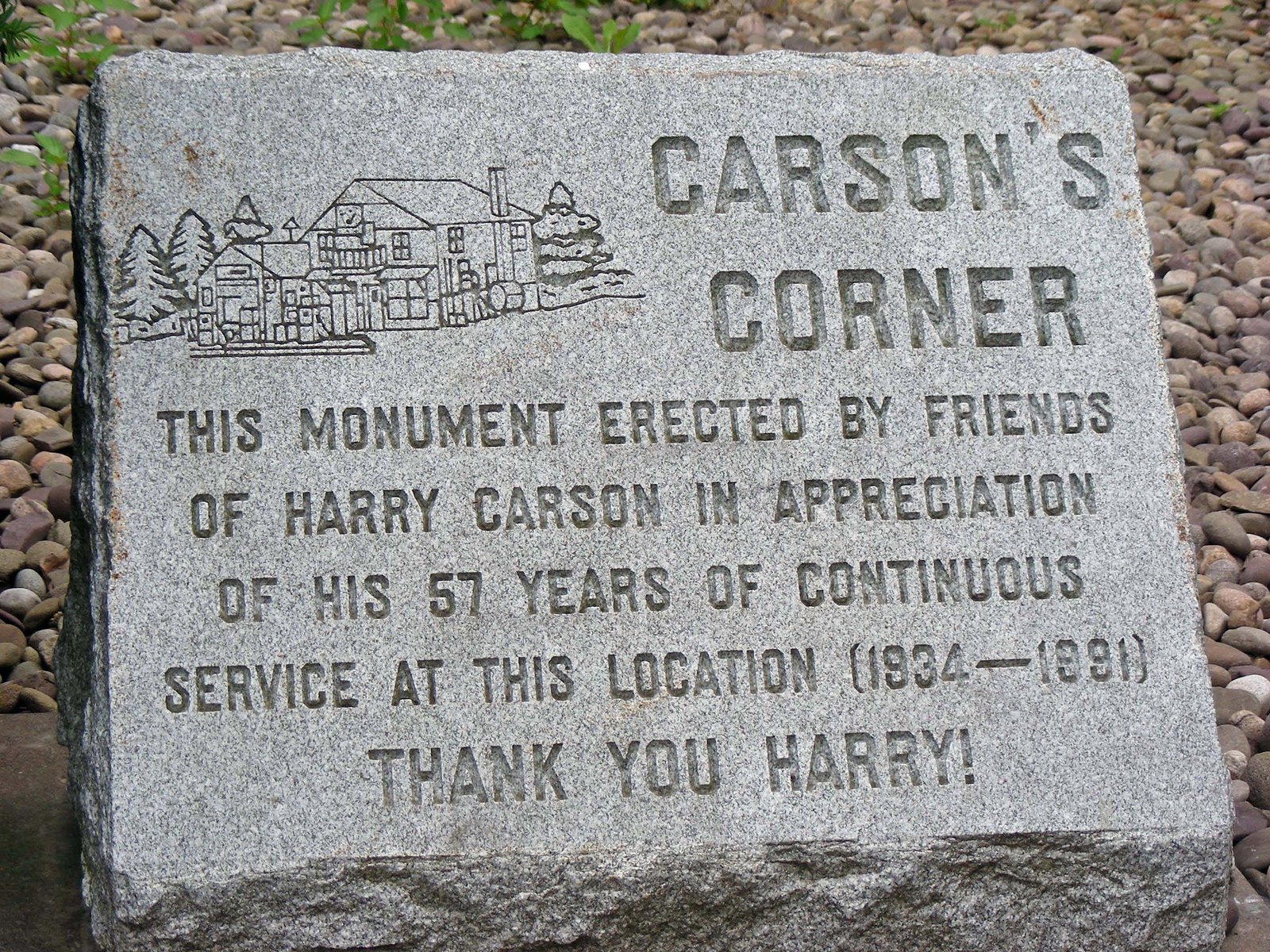Harry Carson’s gas station had been a part of my life for as long as I can remember and he was still there when I made my move away from Pennsylvania. You could always get gas, milk and bread any day of the week, from early morning till late at night, either Harry or his wife Mickie were always there. The original building is gone, replaced by a convenience type store with gas. This plaque is all that remains with a likeness of the original building and garage. Now known as Carson’s corner, it will always be Harry’s to me and all the long time locals.