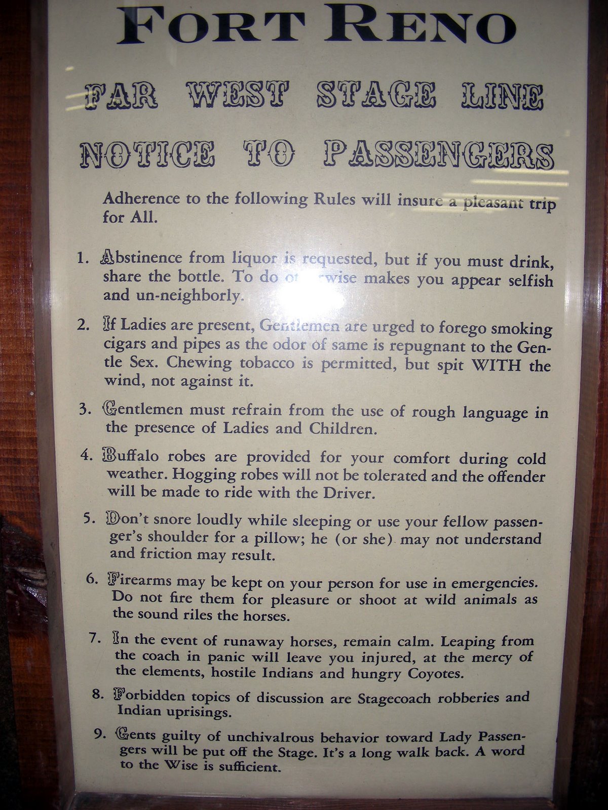 This is a copy of “rules of conduct” for riding the stage coach. I hope you can read them, pretty interesting.