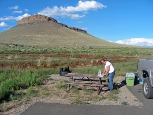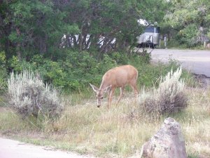 When we turned in to check out the campground, a couple of Mule deer were enjoying an early breakfast. The Airstream trailer in the background belongs to the campground host. It is the smallest trailer Airstream makes so I’m not sure a larger RV would have fit in any of the loops. There are three loops in all with loop B having electricity, for a few more dollars a night.
