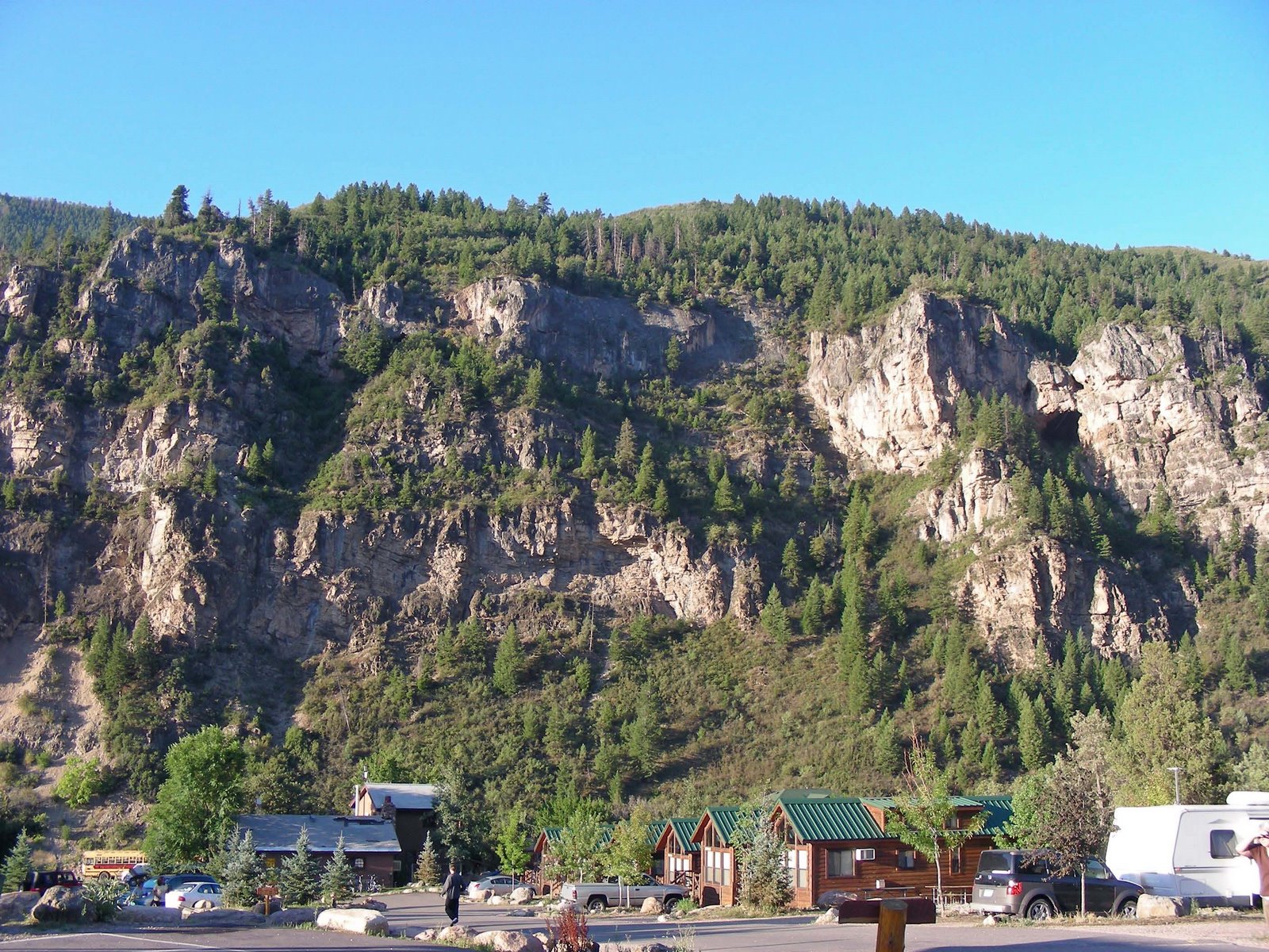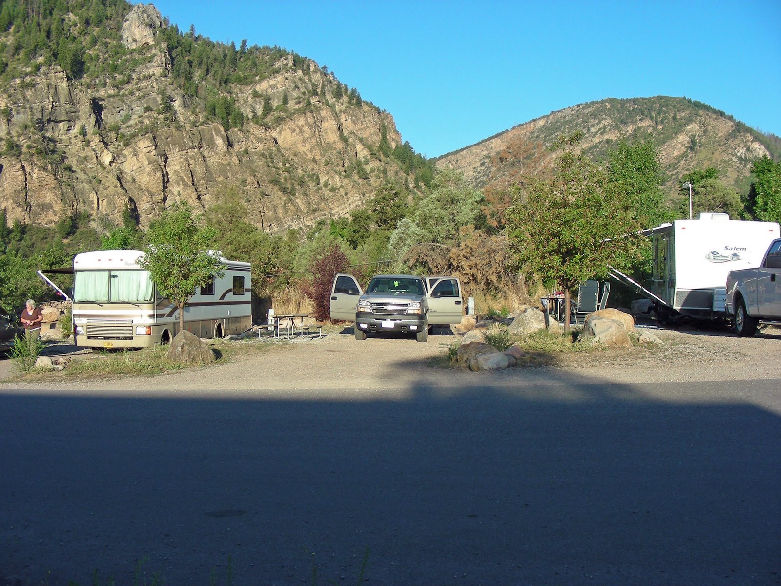 Our rig kind of looks out of place parked in a full hook up site. I’m not sure we got our fifty-six dollars worth for the one night we stayed, but right behind me are the showers and we did get our monies worth out of them. The Glenwood Canyon Resort park is a very nice place to stay, about one and half miles east of Glenwood Springs with a large number of sites right next to the Colorado river.