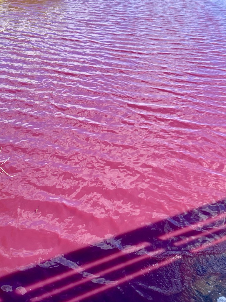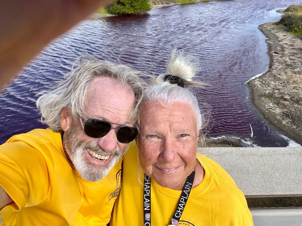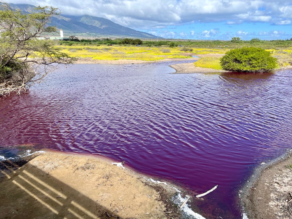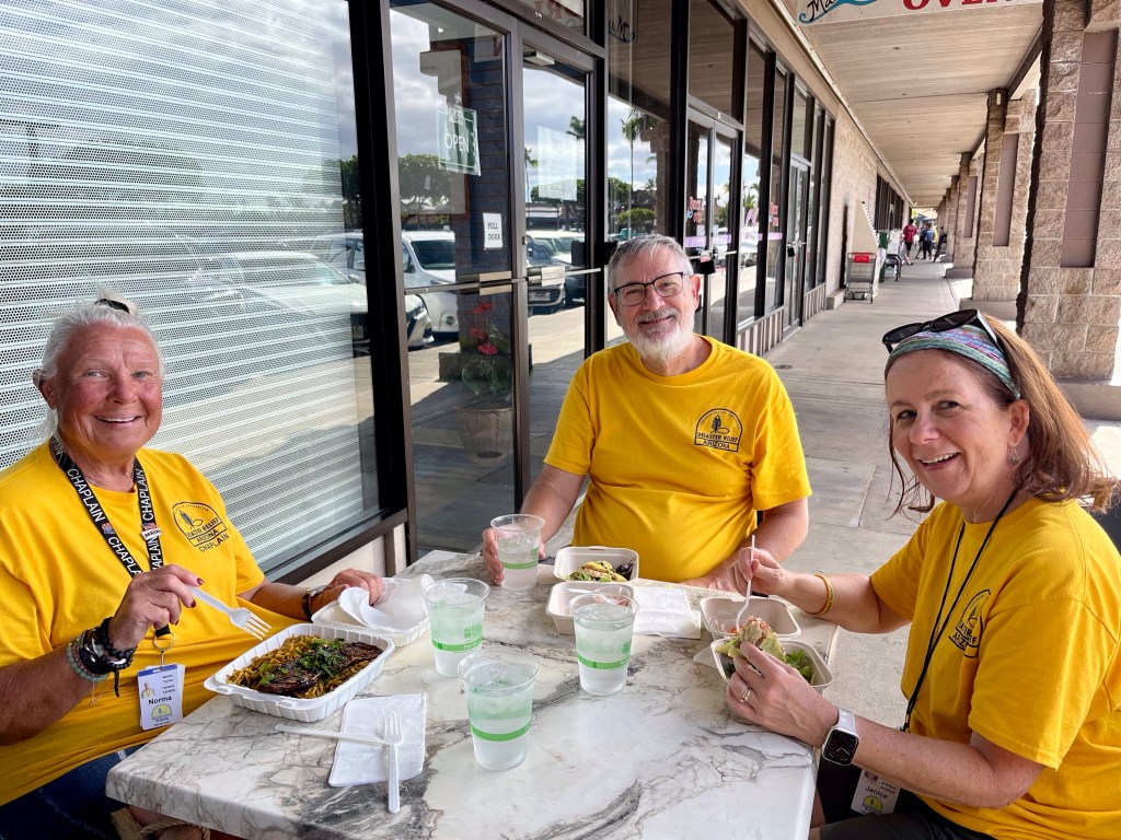 This is White Hat John and his wife, Gay. They are co-directors of Hawaii Pacific SBC Disaster Relief. It has been our privilege to serve them and the residents of Lahaina. Location of the pink pond from yesterday’s report. Of course, we had to go back for a more in-depth look…Part of the pink pond, see below…Okay…It was windy, I think the pond had pink caps…Pink on one side and blue on the other…Be careful where you walk…After an exchange of text messages with Maui born DR Gary, we enjoyed an authentic Hawaiian lunch…Photo courtesy of DR Janice…