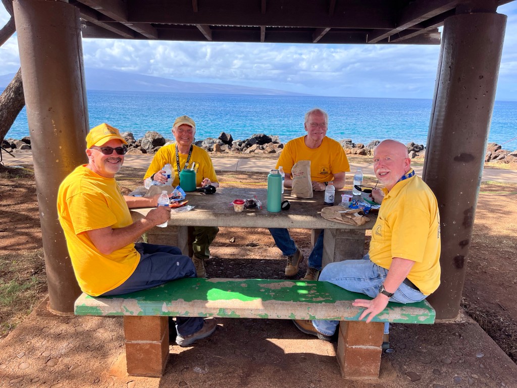 This was a great place to take my break….A homeowner told me today that God will make beauty from ashes…This is Team Arizona. We will be closing out the recovery work in Lahaina. From left to right, Mark, Kent, Janice, Norm and me…At this time we have too many on our team so they will be getting great experience working with other states. This coming Thursday we will back together working as a well oiled machine…My team is always looking for work. No jobs this afternoon so they decided to sort through the trash. Really though, we are trying to save money by recycling bottles, but certain teams and states, which will remain nameless, seemingly cannot follow basic instructions on which trash bag to use. I find it amazing…Today, the four of us dove deep into a local coffee trailer…Good stuff…