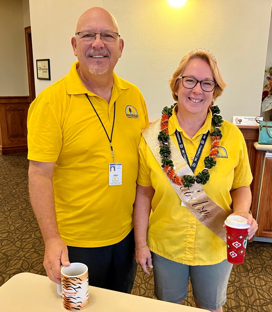 I have the greatest time serving with my all North Carolina team. From left to right, David, Joel, some Arizona guy, Mike and Jim. They did a trailer inventory for Hawaii Baptist, went to serve another Lahaina resident and generally looked good. We are the “A” team. I am pretty sure we are John’s favorites…Did I mention that it is hard work doing inventory? This shot has our team Chaplain in it. She makes the rest of us look good…Instead of selfies, we have chickens…I have no words…