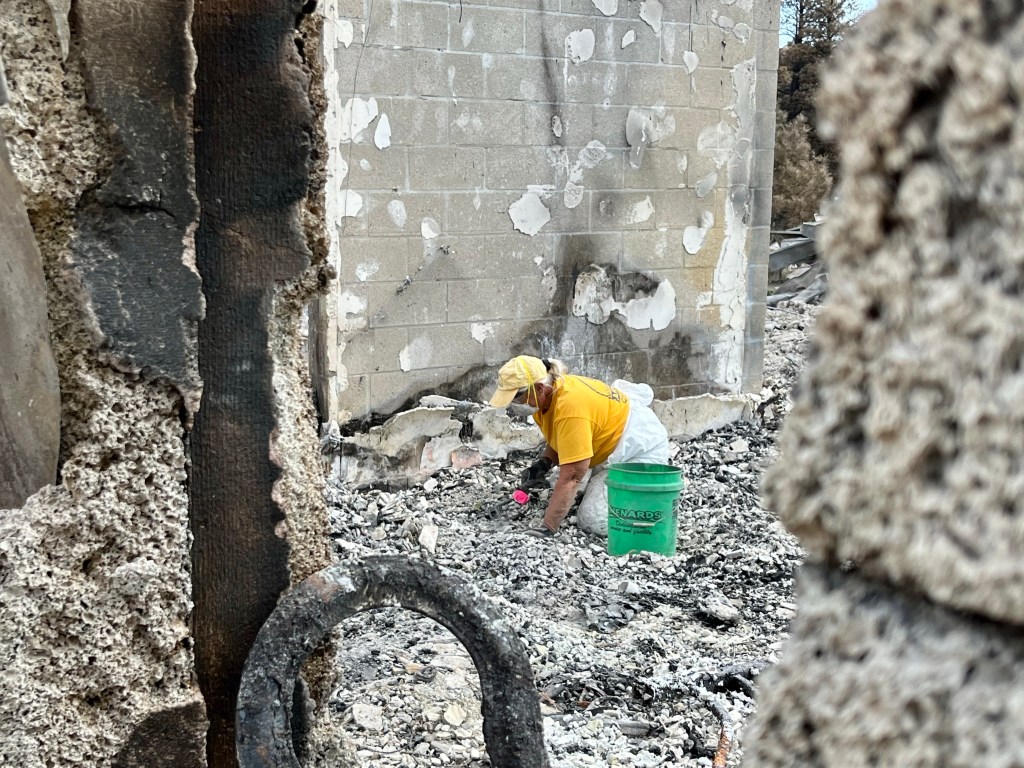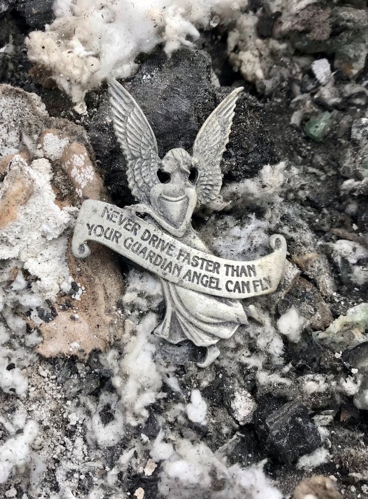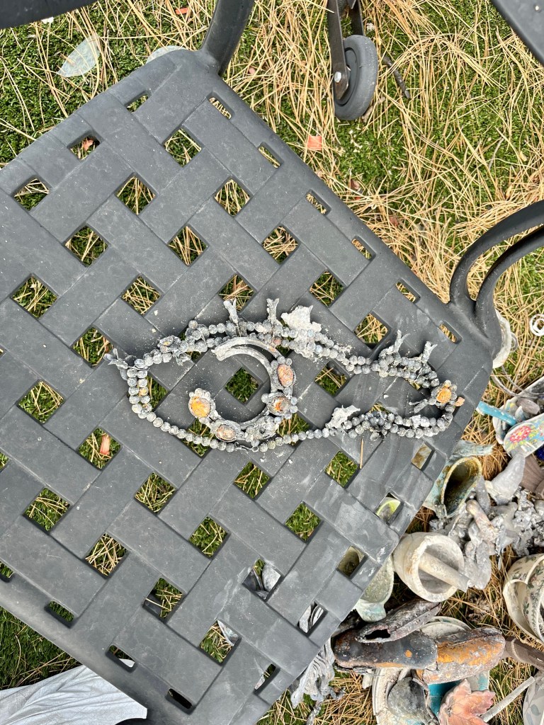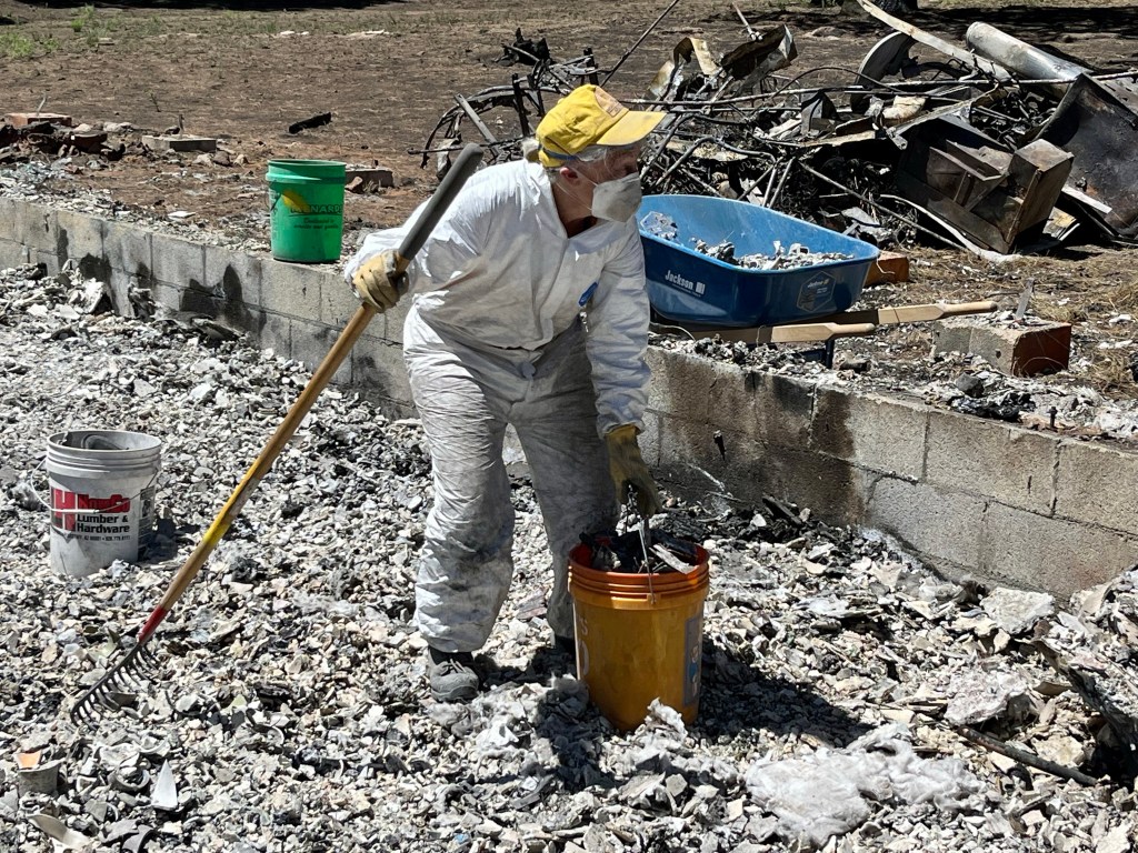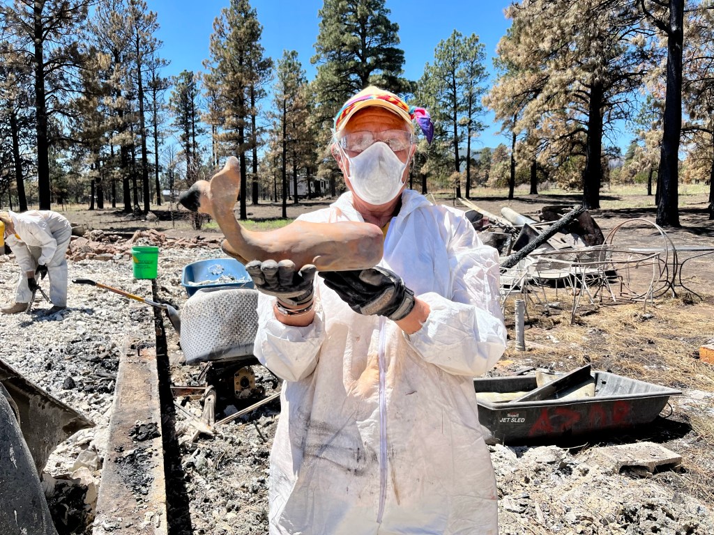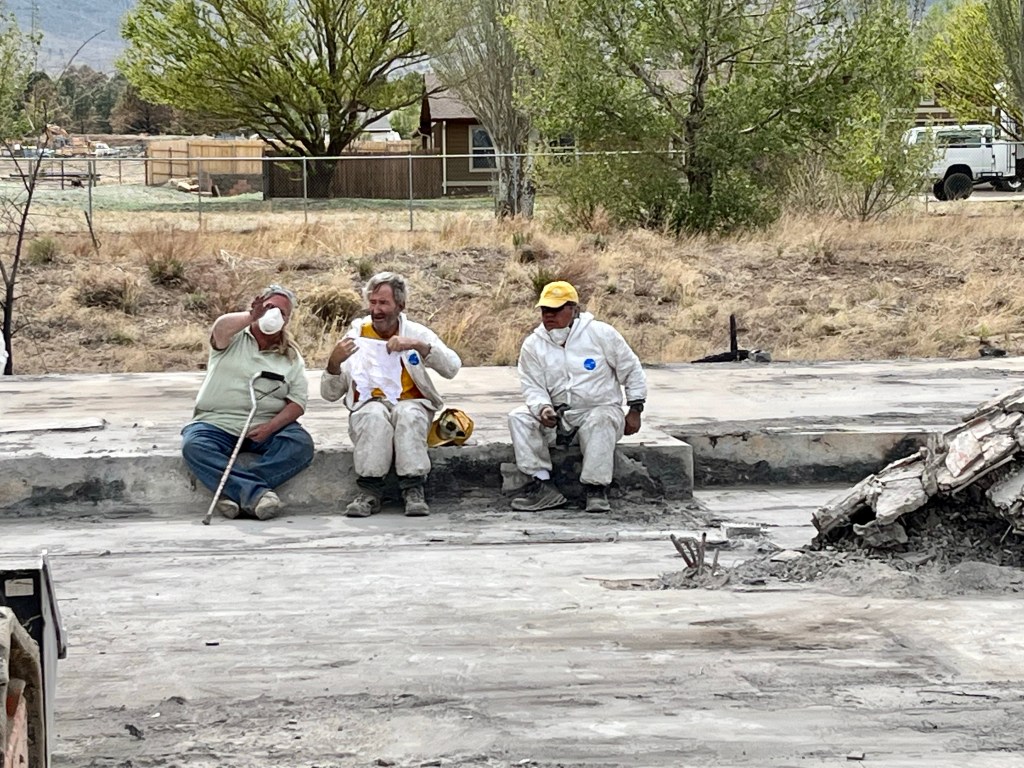 This is Alan and Brenda from Flagstaff. Long time Disaster Relief volunteers, they stopped by to give us a hand, sifting through the rubble…DR Patty adds to the growing finds from the home…Norm, in her happy place. Searching for something of value to the property owners. She did really well today, finding a prized necklace…Necklace find…I hesitate to display this photo. This comes from the inside of a nose, that has been in the confines of a state of the art N95 mask! If you still wear a mask, thinking you are safe, here’s your proof. N equals one experiment. If this mask cannot keep ash from you, it’s not keeping a much smaller particle illness from you…