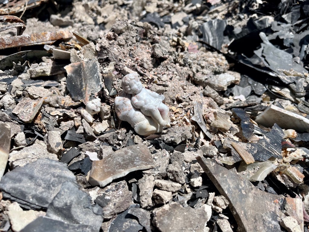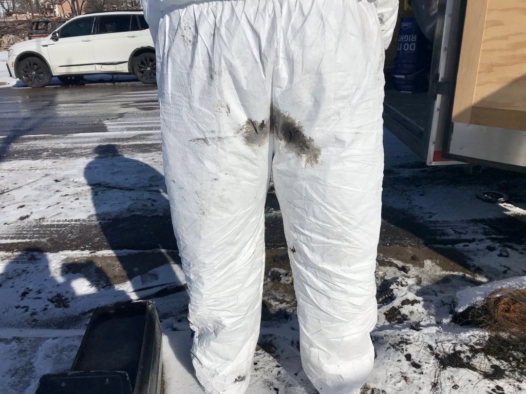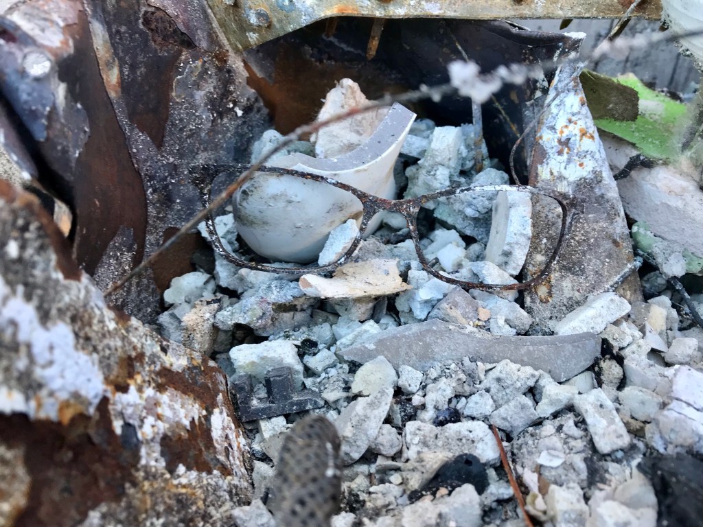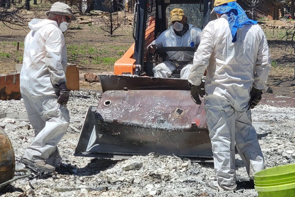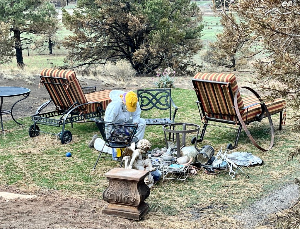 This is Alan and Brenda from Flagstaff. Long time Disaster Relief volunteers, they stopped by to give us a hand, sifting through the rubble…DR Patty adds to the growing finds from the home…Norm, in her happy place. Searching for something of value to the property owners. She did really well today, finding a prized necklace…Necklace find…I hesitate to display this photo. This comes from the inside of a nose, that has been in the confines of a state of the art N95 mask! If you still wear a mask, thinking you are safe, here’s your proof. N equals one experiment. If this mask cannot keep ash from you, it’s not keeping a much smaller particle illness from you…