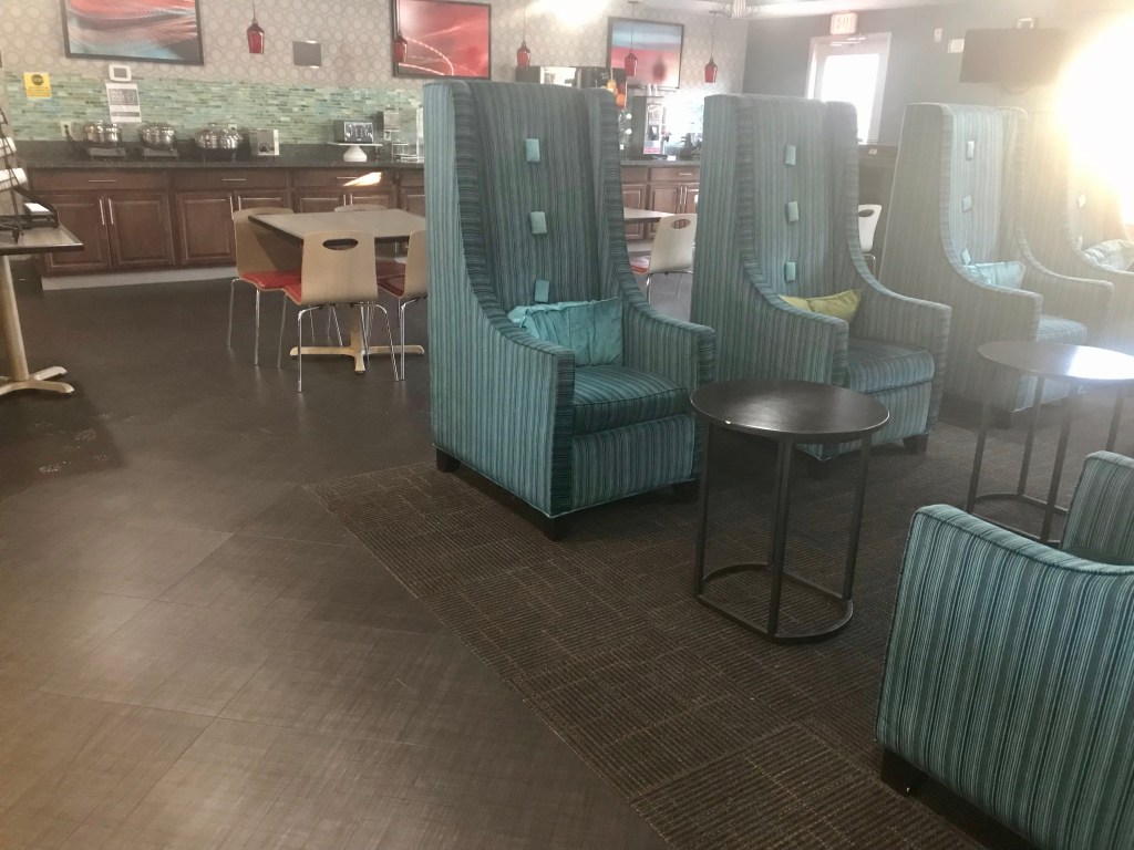 Norma, with Fran on the left, Sue on the right, discussing the current outside temperature of 8 degrees. The last kick of Colorado cold before departure…Most of the morning our windshield was hard to see through…I40 eastbound, trucks…Route 66 eastbound, more trucks…And then it was our turn to be stopped westbound…The most unusual looking chairs in the lobby of the Best Western in Gallup New Mexico…