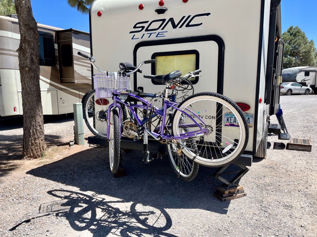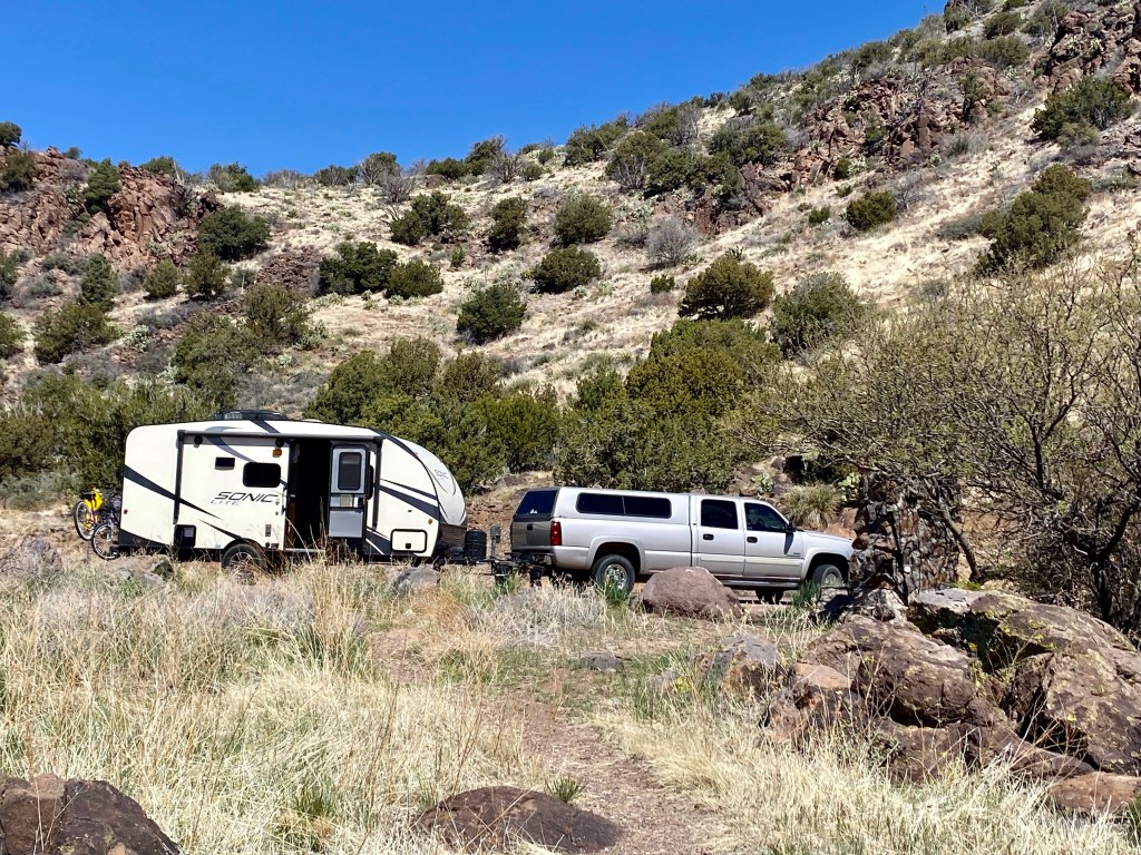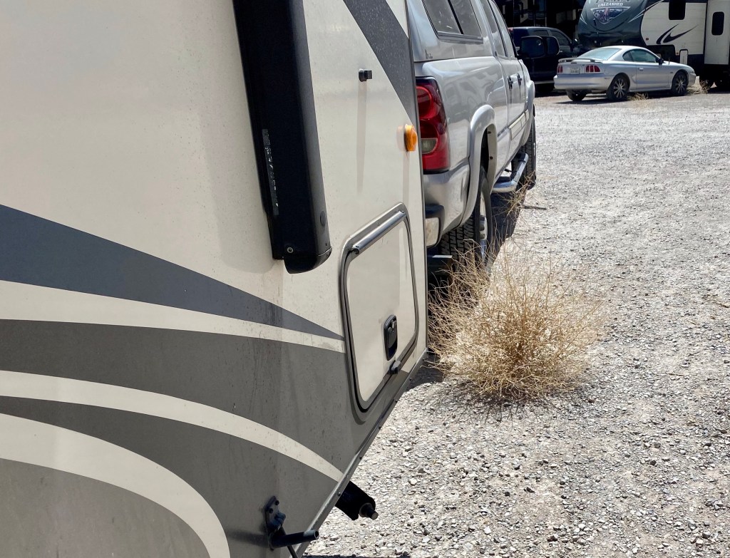From years of traveling Texas, Oklahoma and Kansas roadways l’ve noticed something kind of cool. Almost, not all of the pickup trucks that pass in the opposite direction wave at us. No women, and there are very few that drive pickup trucks in said states, ever wave. No men in cars wave, just pickup trucks. Like a brotherhood of pickup truck drivers. Only these three states, not New Mexico or Arizona. In the past, I have tried waving at fellow RVer’s so we could have a fellowship of nomadic travelers. Never worked out, and my hand just got tiered.I told myself as I loaded our bikes, after hurrying to repair flat tires, that we probably would not use them. We didn’t.This is one of four tumbleweeds that collected together between our truck and trailer.Not a good photo, but heavy wind and dust here in our second day at the Bar S campground. Wind currently is 30 mph gusting to 56 mph. Hoping for better weather tomorrow…