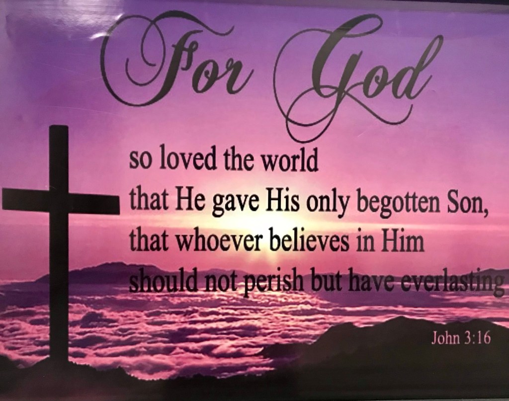 “For God so loved the world, that he gave his only begotten Son, that whosoever believeth in him should not perish, but have everlasting life. For God sent not his Son into the world to condemn the world; but that the world through him might be saved.” John 3:16-17