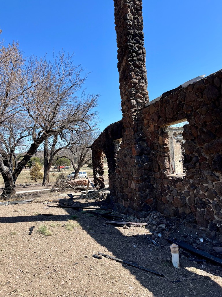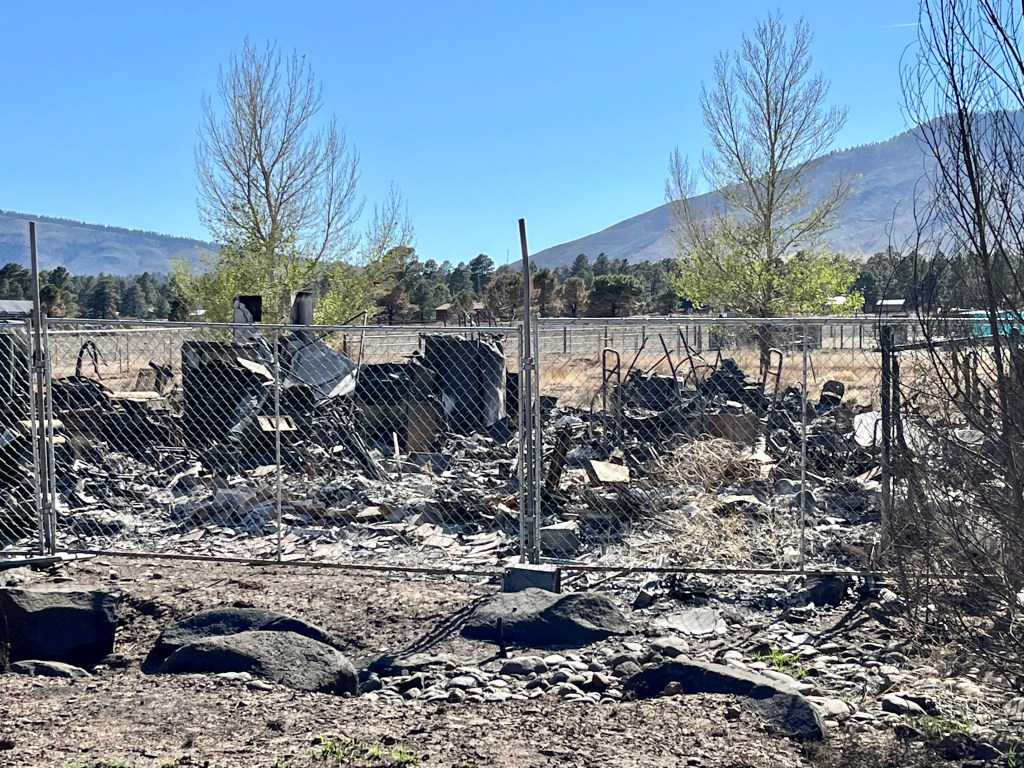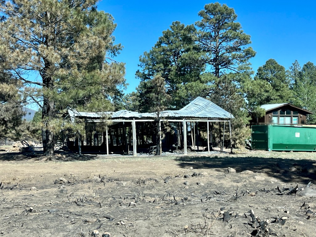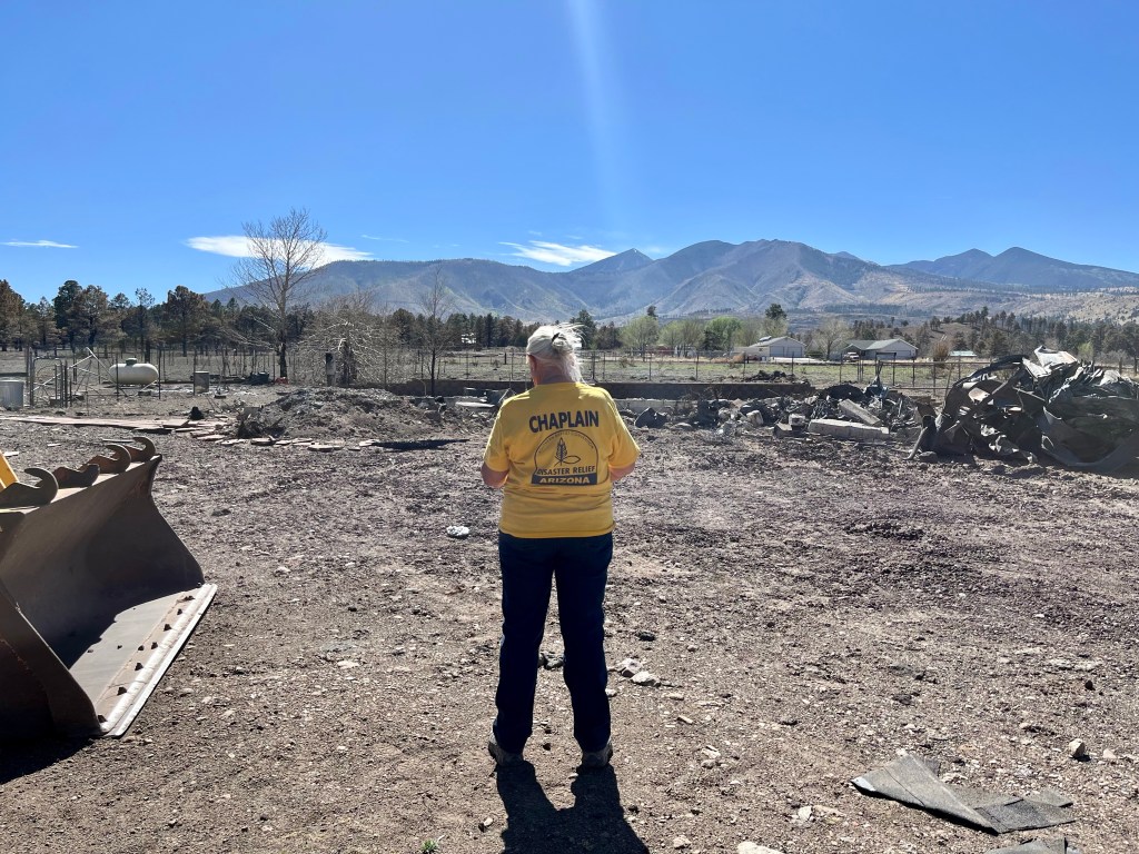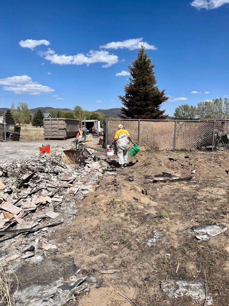 Yesterday we had the blessing of attending church service here at FSBC Flagstaff. This is a fantastic church that prayed for us numerous times yesterday. Norm, doing what Norm does…The quiet time of any call out- chow time…This was a family home of 33 years…Mr. Wells is holding up the remains of his 2001 Plymouth Prowler, built with an aluminum chassis. This family lost their house, the oldest pole barn in Arizona, several classic cars and a few motorcycles. Mr. Wells is retired military and a Vietnam Veteran. It was a pleasure to meet and talk with him…