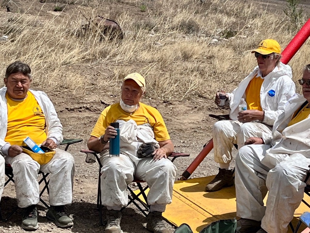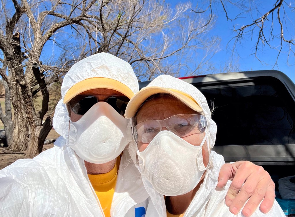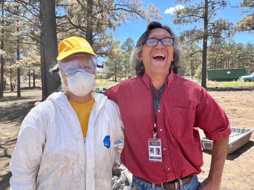 Thanks to DR Sue for snapping this shot of me, operating the skid steer, trying to move one of four heavy bath tubs…Not sure if this was the result of my driving, but the track came off and put the machine out of service for about a half day…Warm day, we kept chasing the shade…Our state director, Patty shares a light moment with Ray, our liaison from Coconino County. Ray has been the best government worker ever…It was our pleasure to serve the Lord…