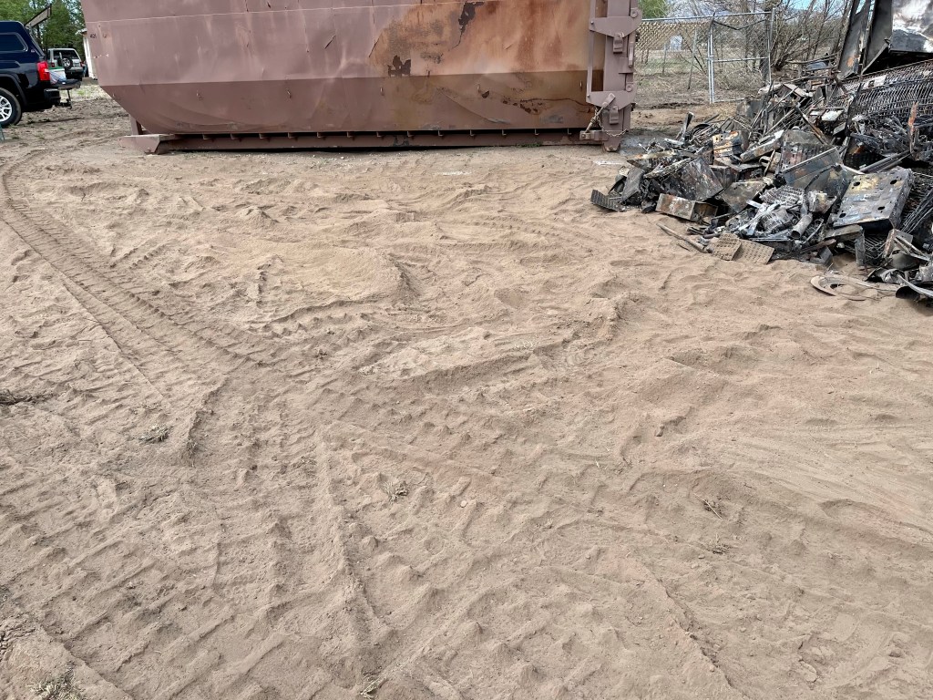 Our team made these pile of metal, from just one property…Everyone is hard working…You can’t tell from this photo, but this is pure dust, about six inches deep and every time the skid steer drove over it, it created a dust storm…We used wheel barrows to load this much…DR Mike, takes a well deserved break…It’s not all work, sometimes you just have to enjoy a cool beverage…DR Dennis and DR Mike do ministry with the property owner…Before AZDR and…After AZDR, we worked almost two full days and a few hours tomorrow will complete the property…