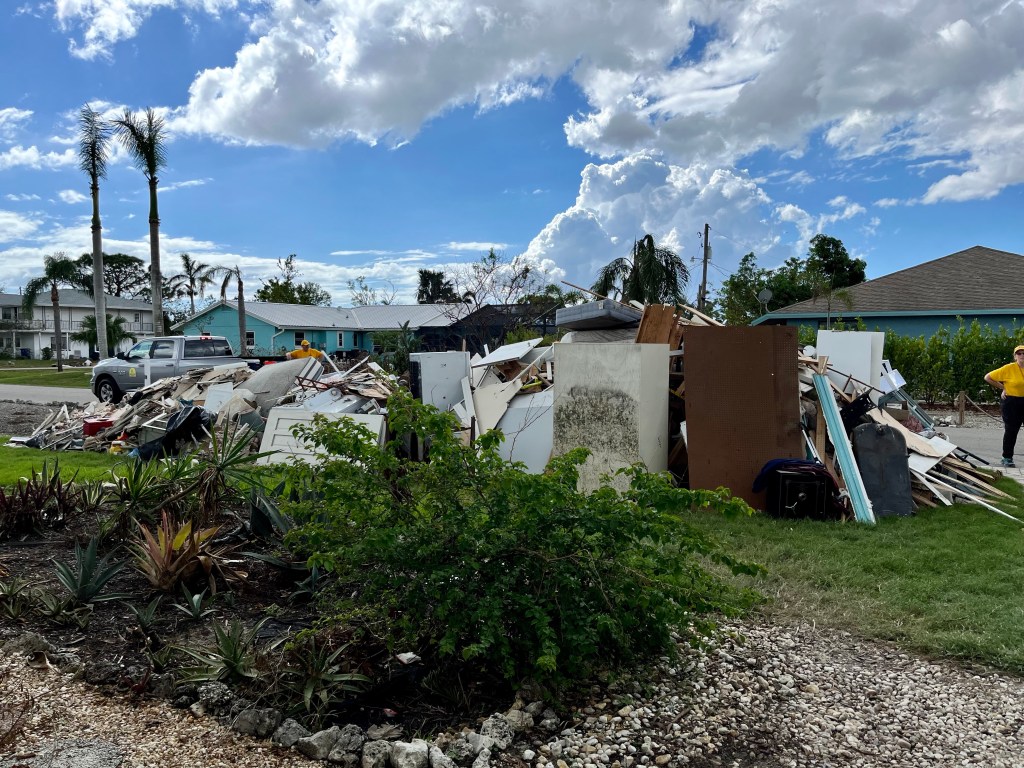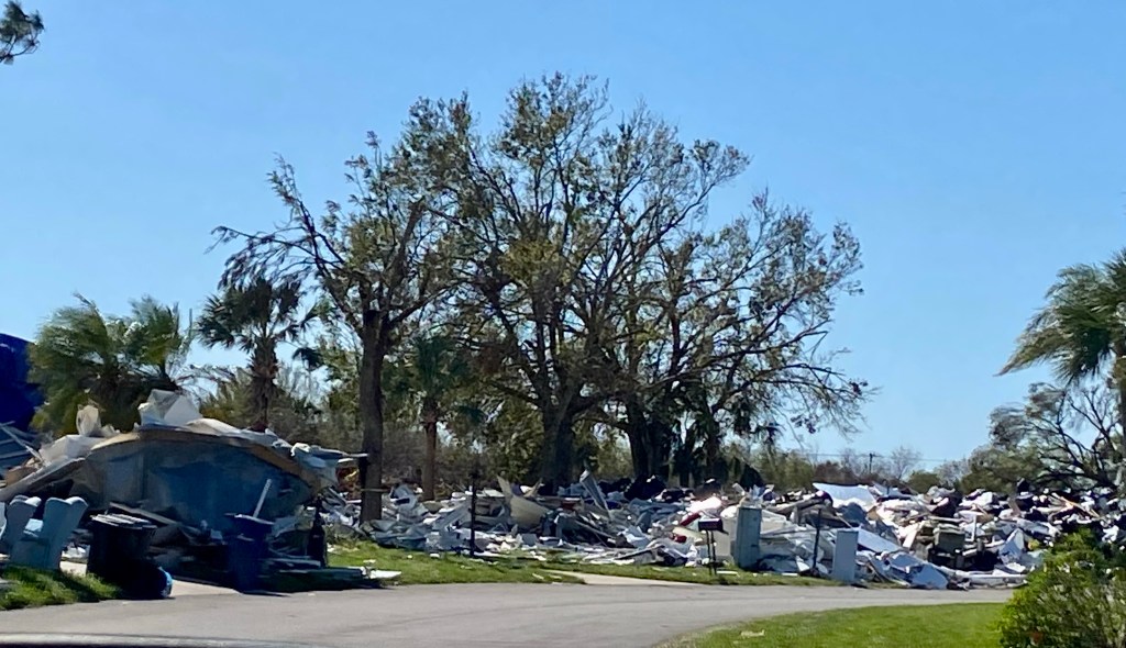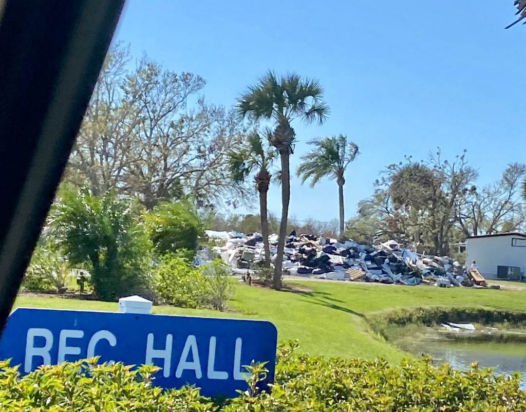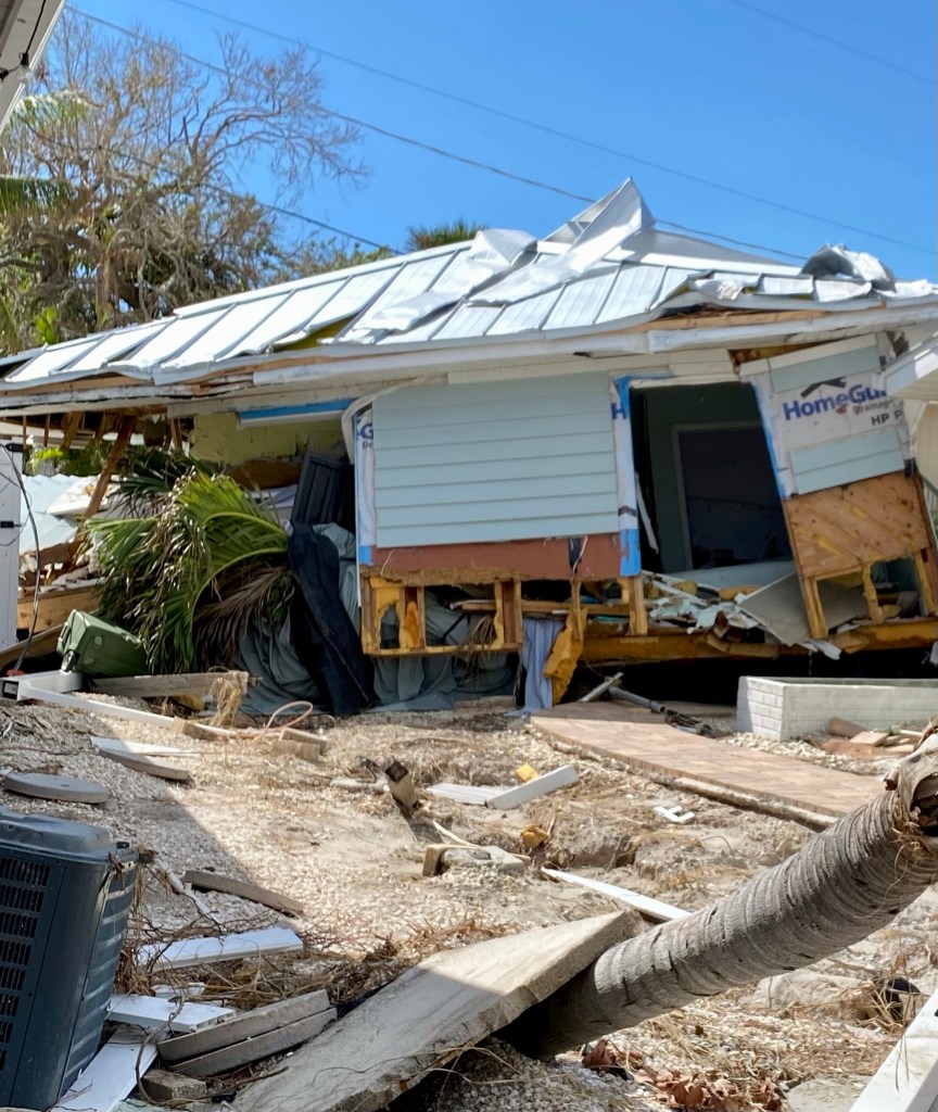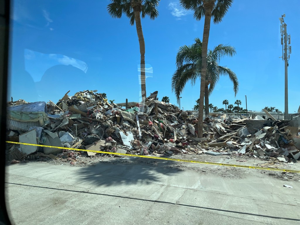 Fort Myers Beach…This series of photos are all from the beach area…Many homes and the church Norm worked out of are condemned. Under this house is another house! The one you see came from somewhere and landed on it!!!Our final debris pile…This is the house we worked on yesterday. Finished as best we could, a new house tomorrow…