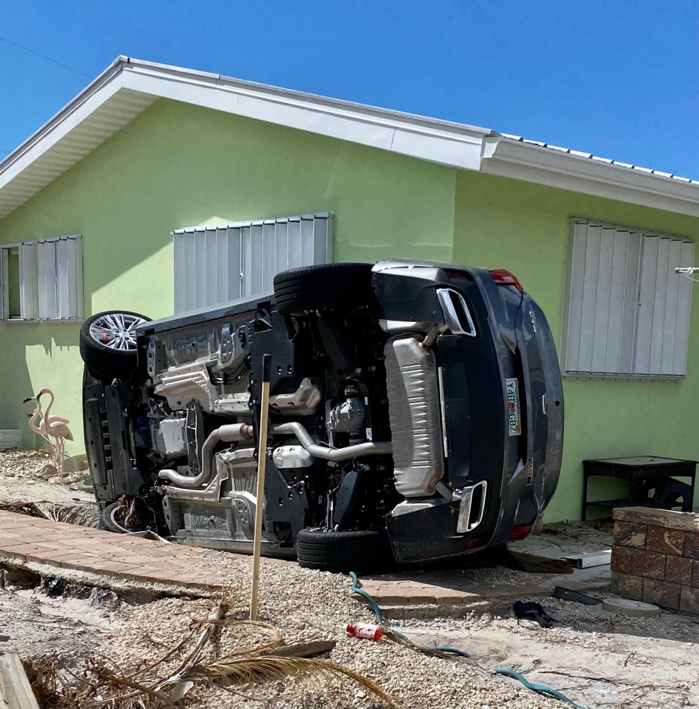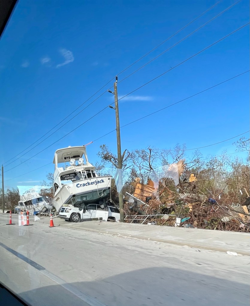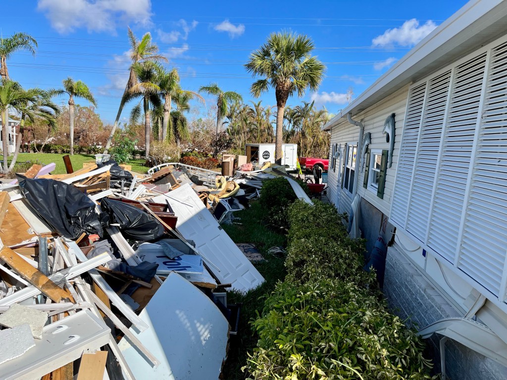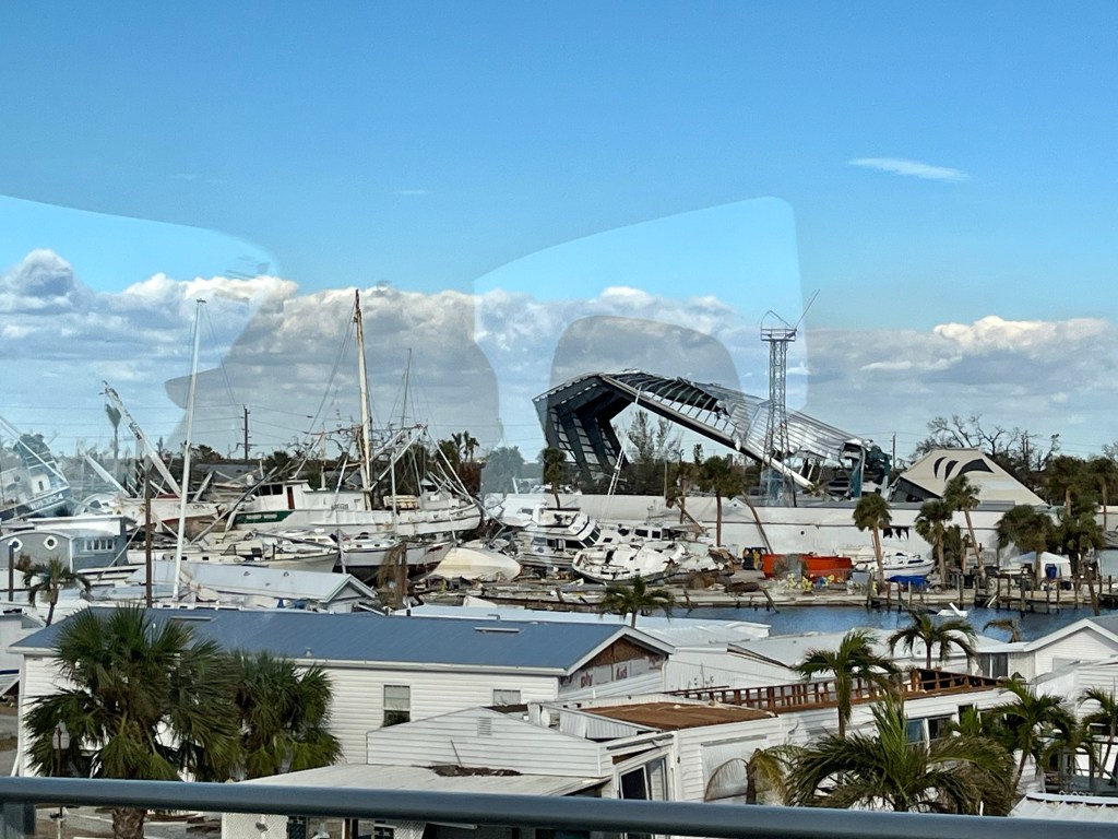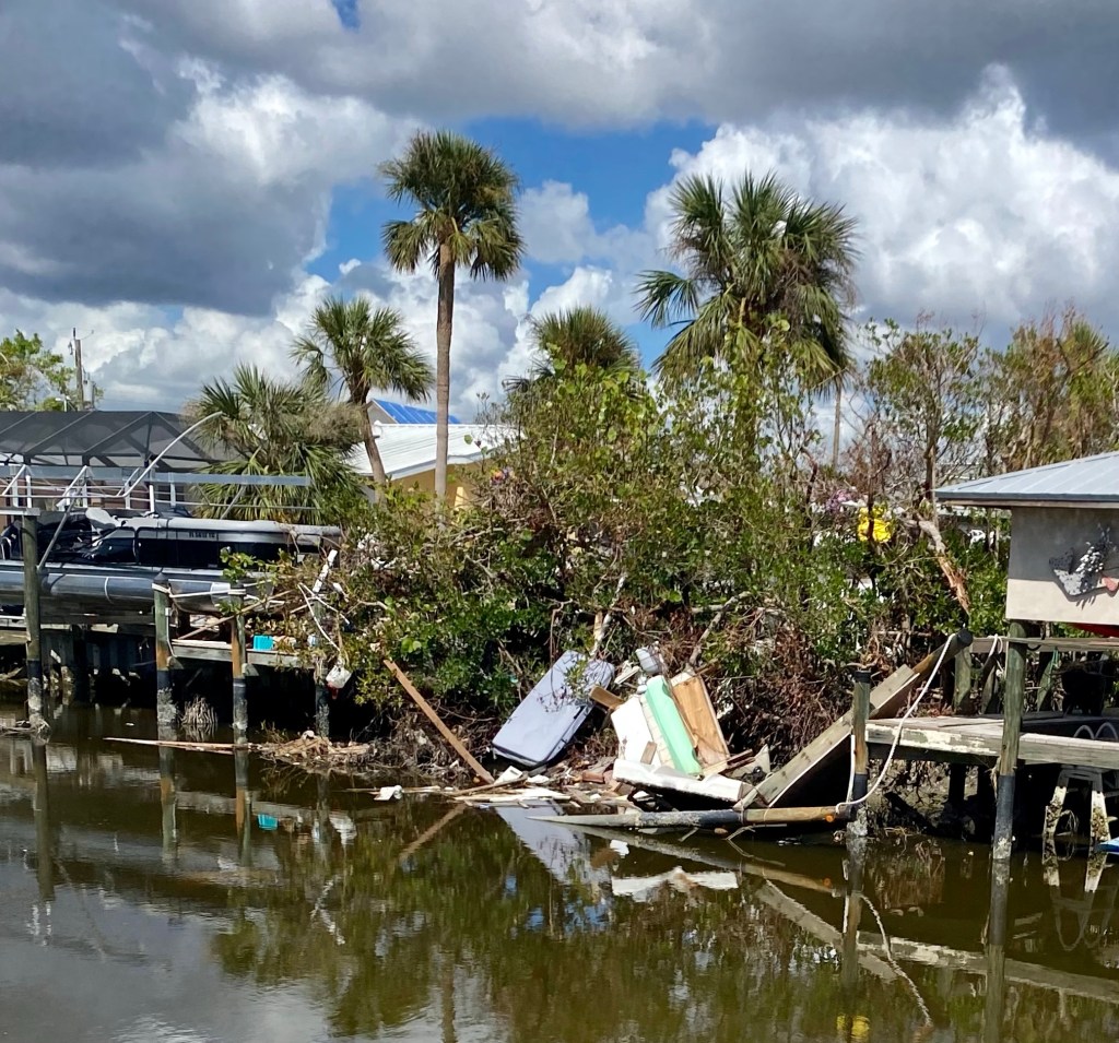 Fort Myers Beach…This series of photos are all from the beach area…Many homes and the church Norm worked out of are condemned. Under this house is another house! The one you see came from somewhere and landed on it!!!Our final debris pile…This is the house we worked on yesterday. Finished as best we could, a new house tomorrow…