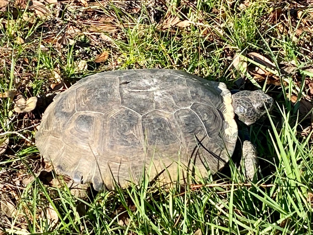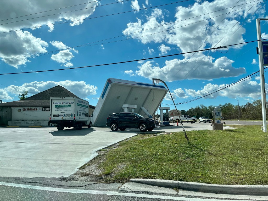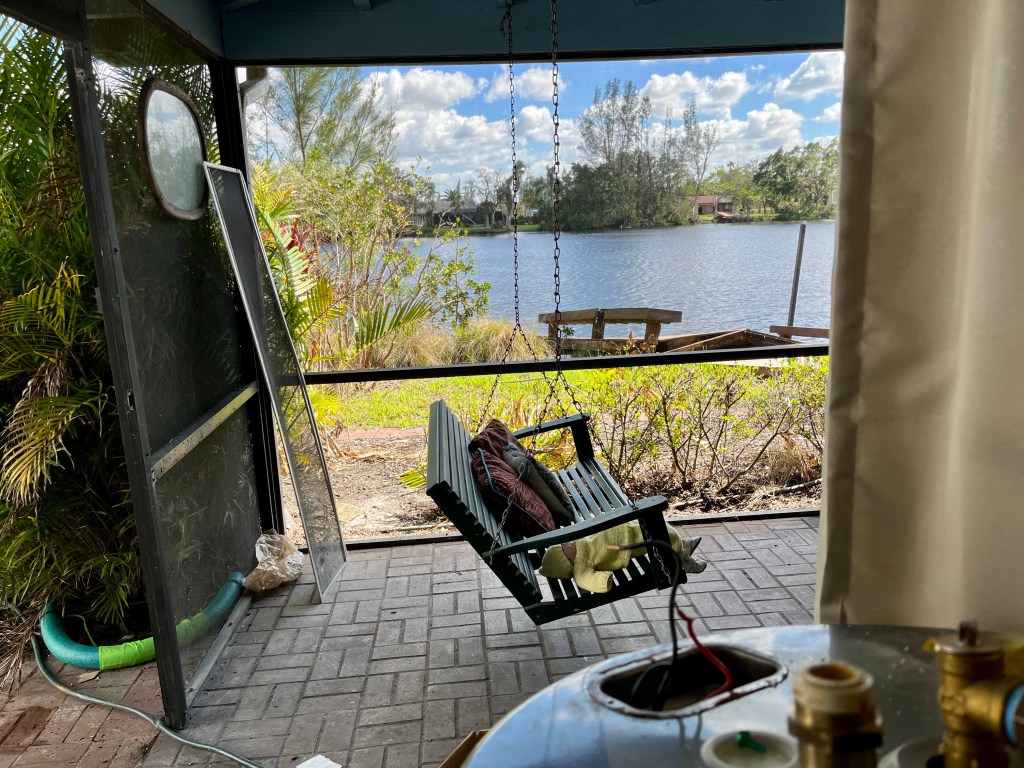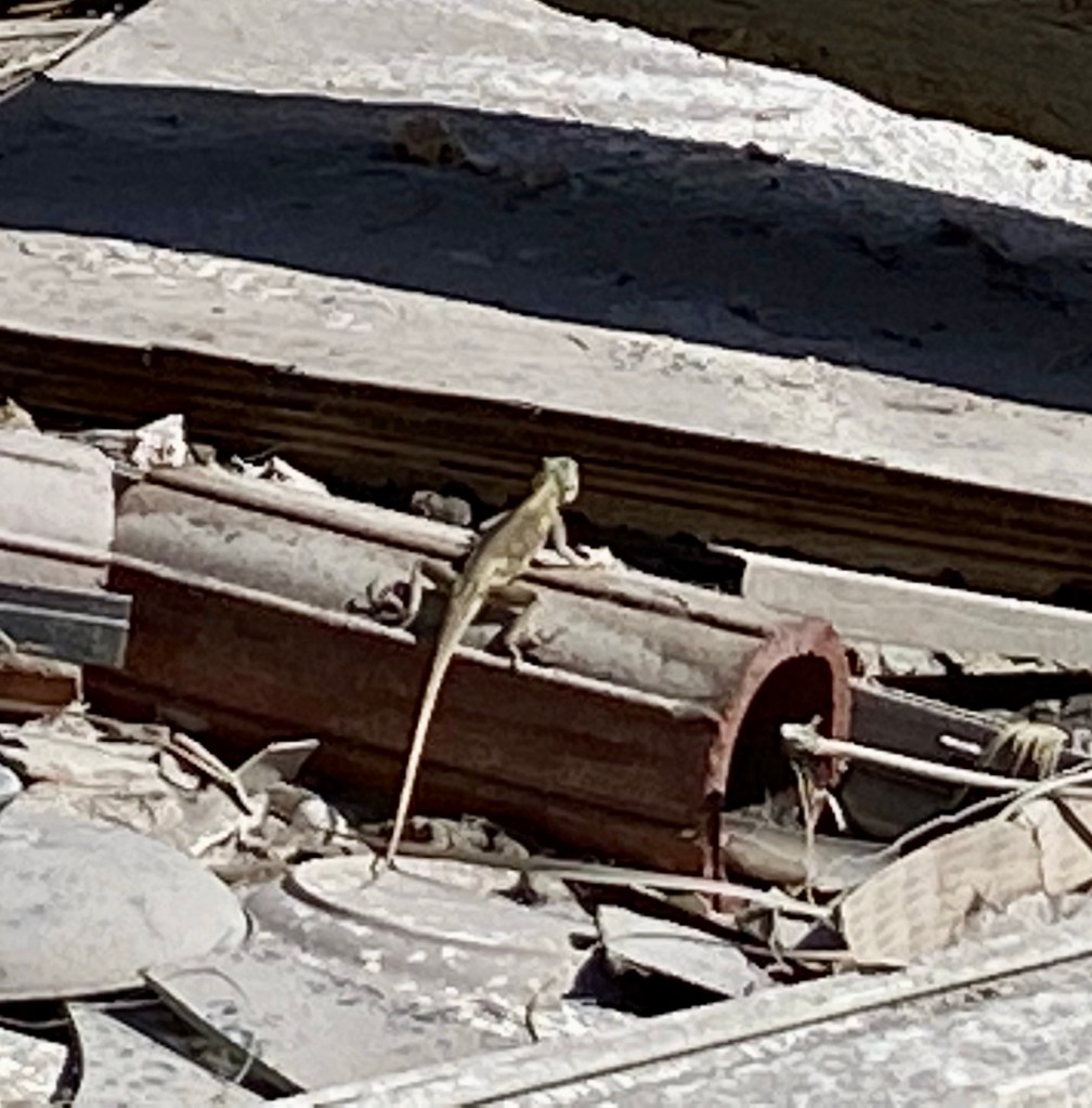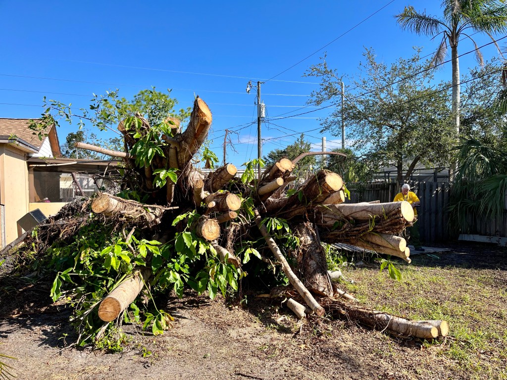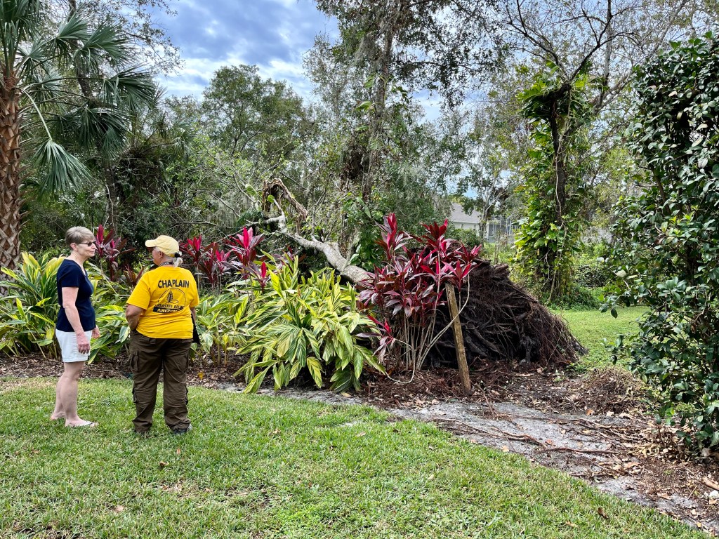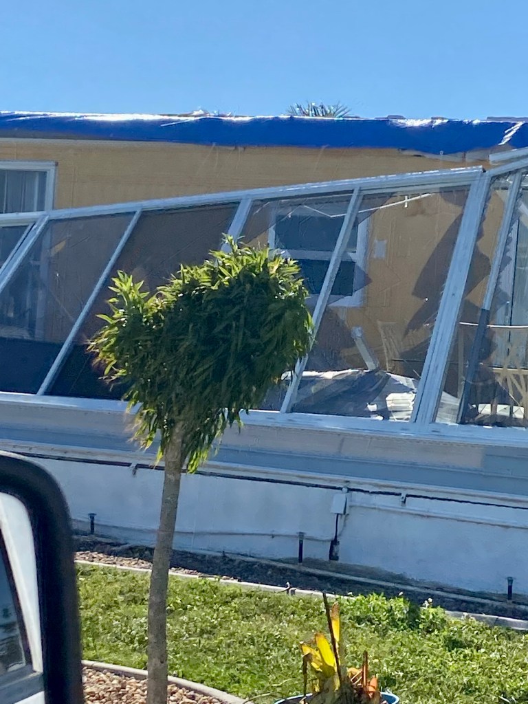 My room is pretty empty as my five other mates left this morning…This has been our work station since last Sunday. Phone calls in the morning and paperwork in the evening. In between many wonderful people, many sad stories and many prayers…After encountering Clyde the Gopher Turtle yesterday, it was another animal day. This is Marty, a rescue dog. She likes me…Not sure what this thing is, but he sure had Norm on edge…Yikes!!!The homeowner told us the hurricane blew his potted plant from the ground to the roof…We had dinner out at a local BBQ place and a nice couple bought our dinner and never told us. Thank you both for such a nice treat…