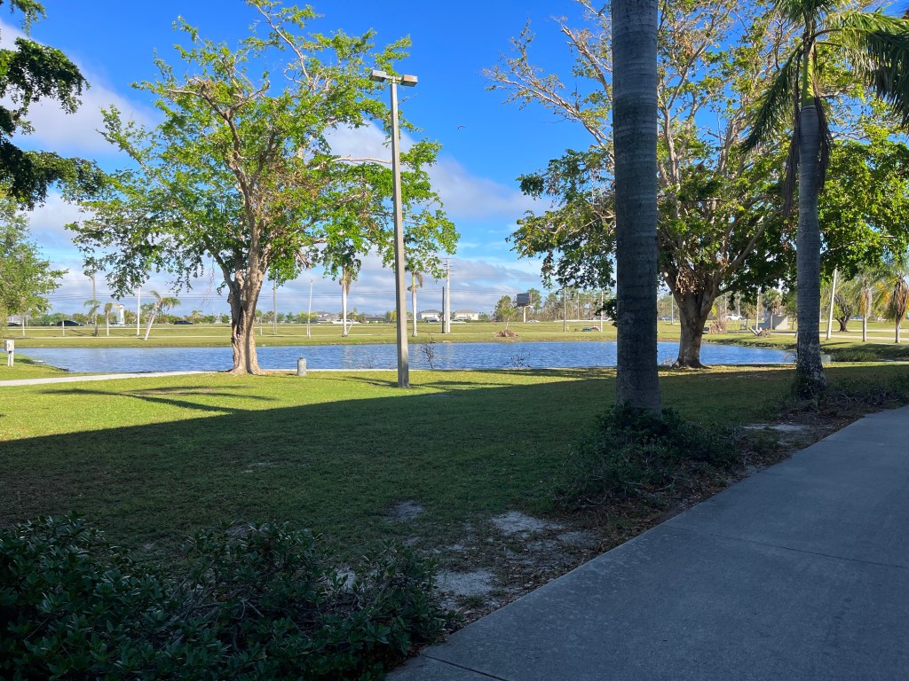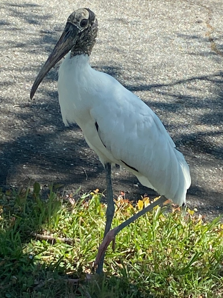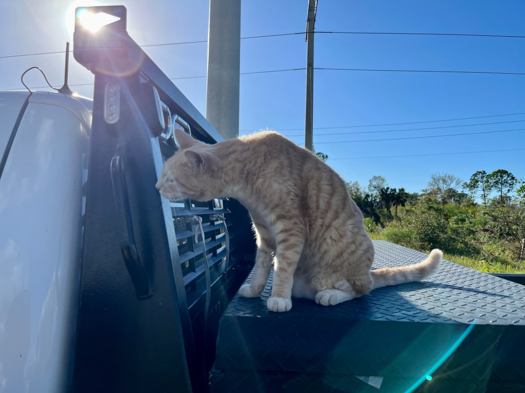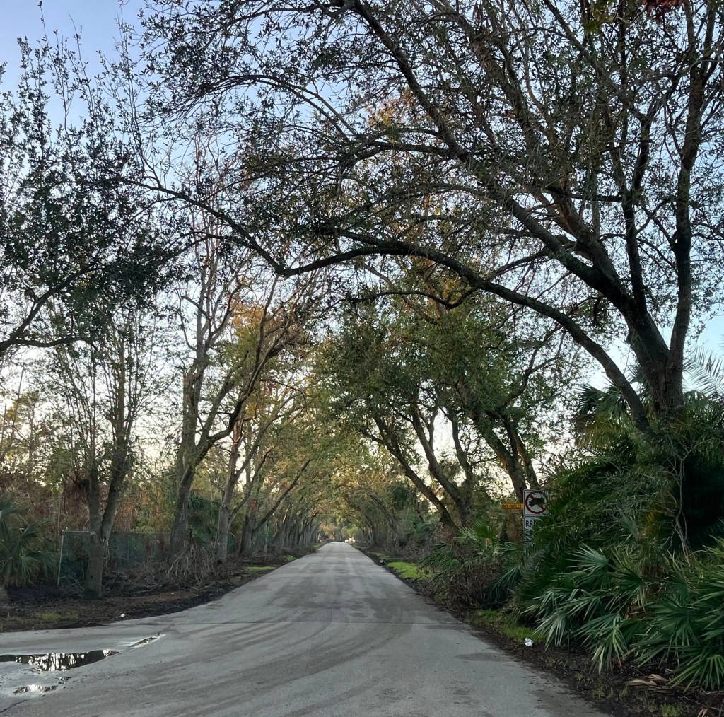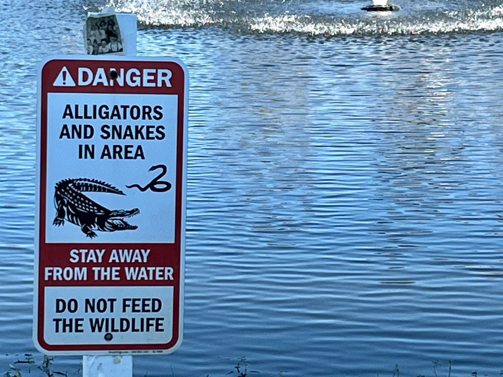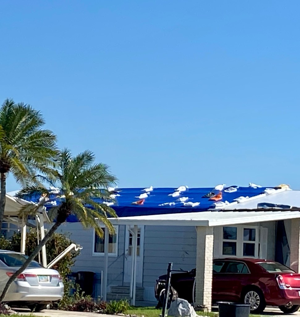 Giving the love of God to Miss Charlene…Norm preparing our lunch in the Publix’s parking lot. We sat on the curb in the shade and enjoyed…These next series of photos are from North Port, a town south of Venice…Sandbags are normally used on tile roofs…Norm wanted to wait and see how this scrapper dude was going to get that metal out of the tree? We didn’t…I think this fella was named Clyde…