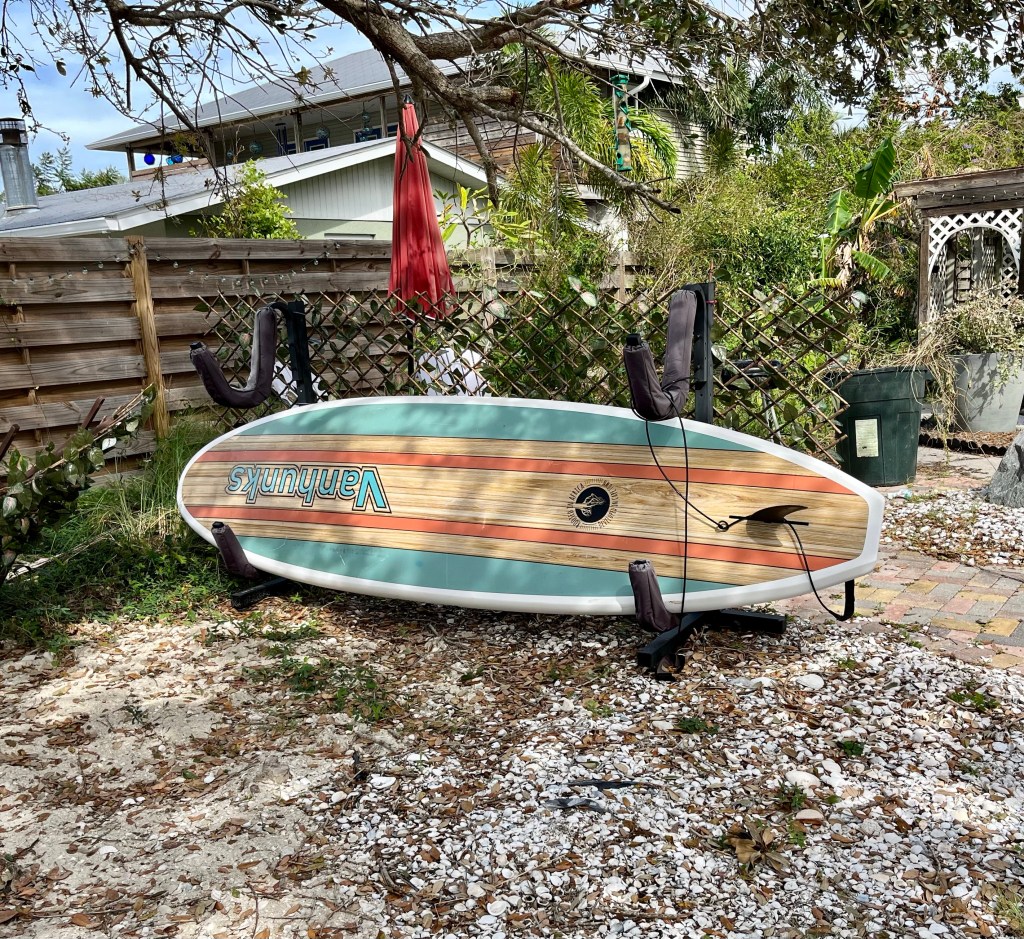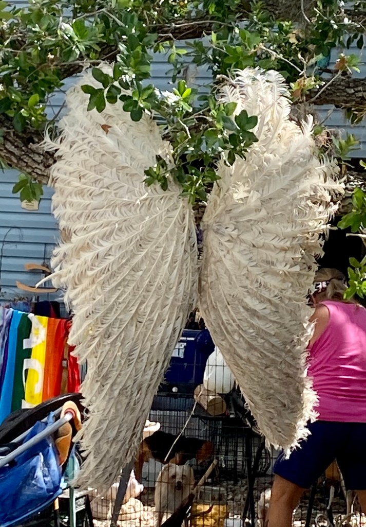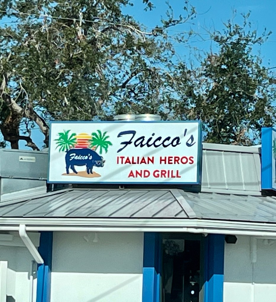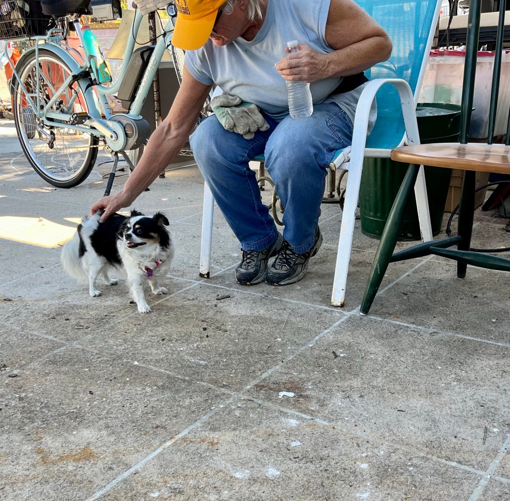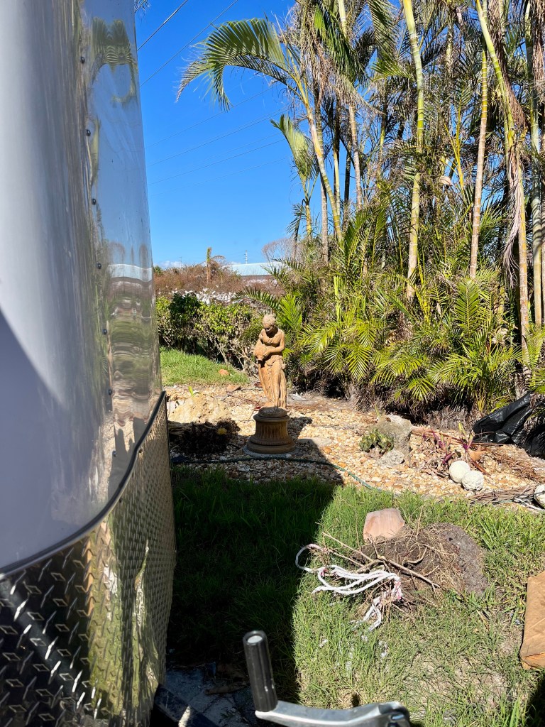 Giving the love of God to Miss Charlene…Norm preparing our lunch in the Publix’s parking lot. We sat on the curb in the shade and enjoyed…These next series of photos are from North Port, a town south of Venice…Sandbags are normally used on tile roofs…Norm wanted to wait and see how this scrapper dude was going to get that metal out of the tree? We didn’t…I think this fella was named Clyde…