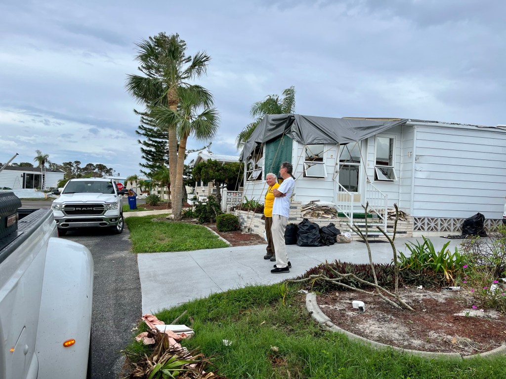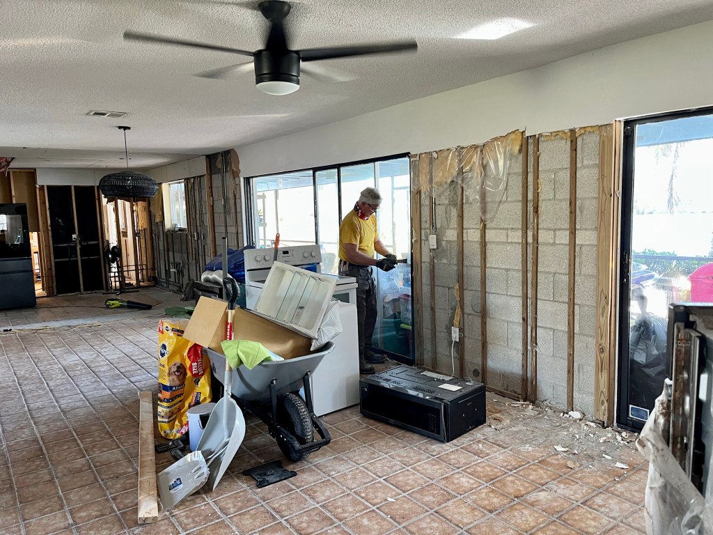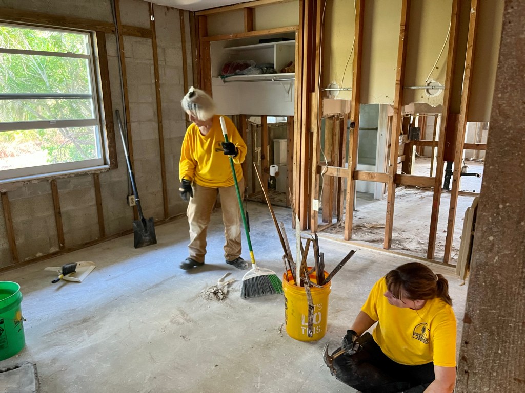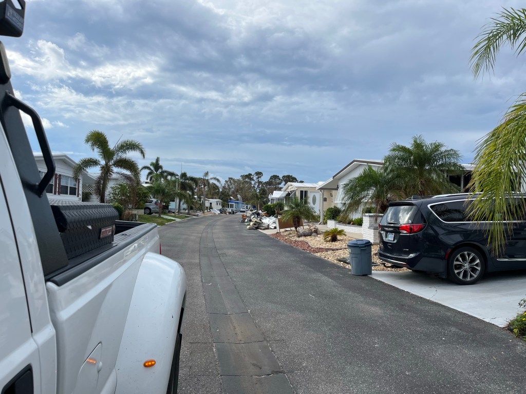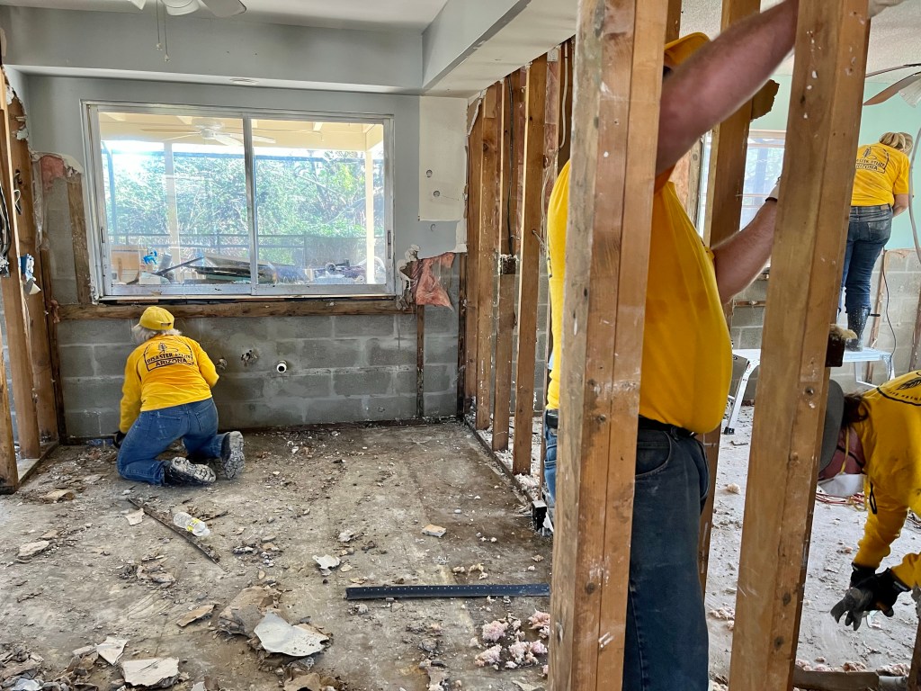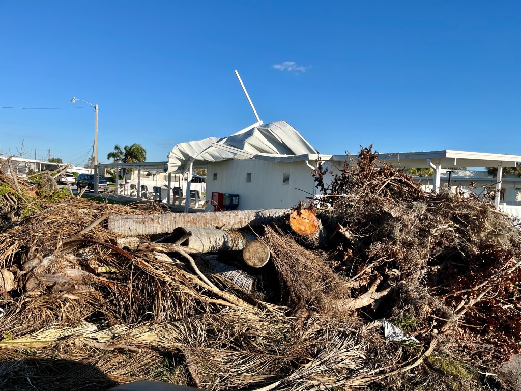 Mobile homes took the worst of the storm..Norm and a homeowner looking for gators in the pond across the road…The roof was torn apart in this home. Big job…We are packed to the gills now, standing room only inside the dining hall…