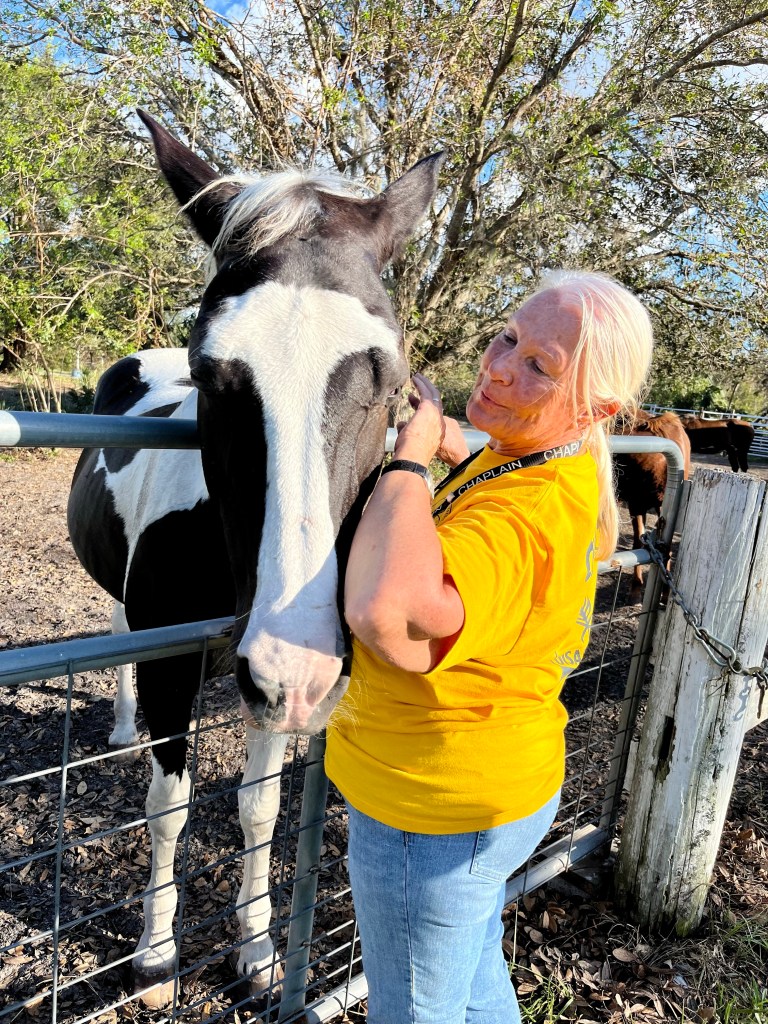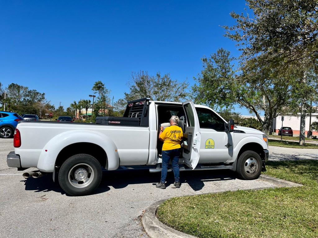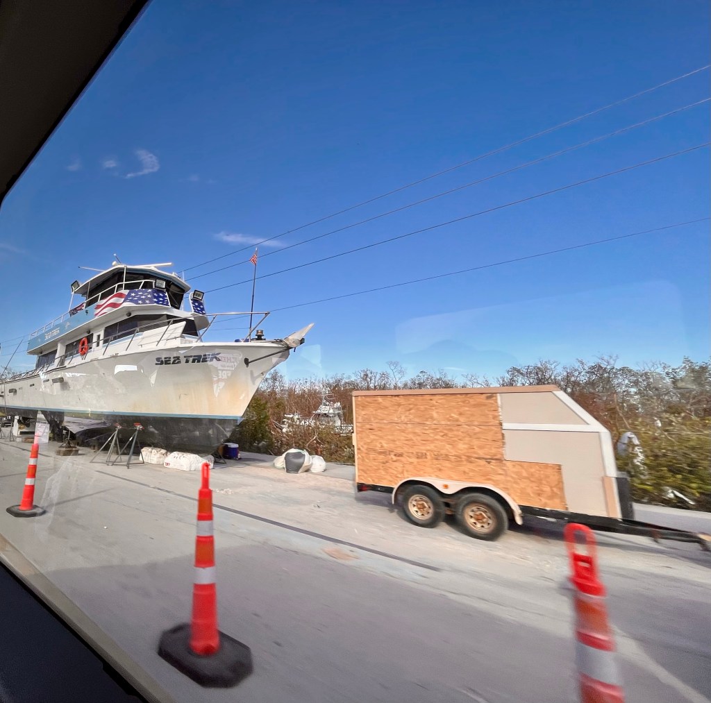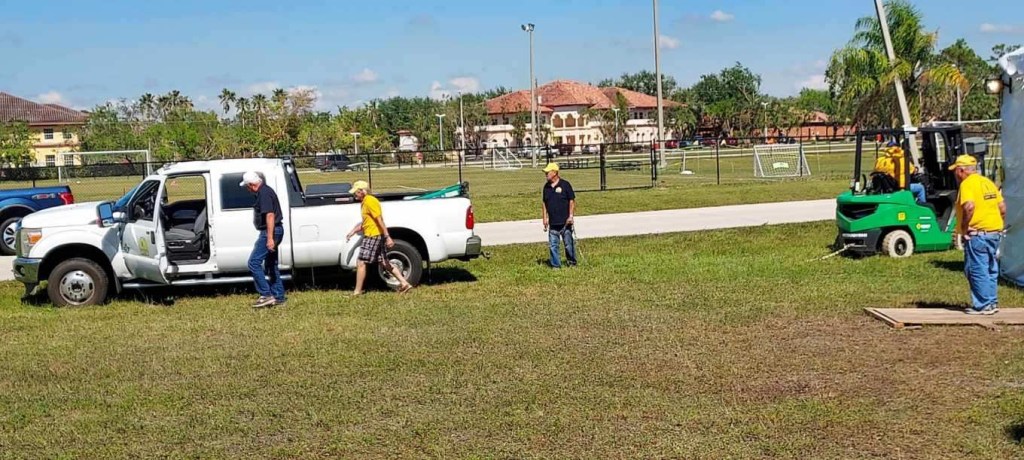 Norm has been working with other Chaplains serving at Beach Church, Fort Myers Beach. They are praying and helping the residents cope with this disaster. When she gets a moment, she finds some nice shells…This guy was hanging around the feeding unit this morning…This my new job. I went out for two days with my adopted mud out team from Tennessee. They took really good care of me. But I was needed in the kitchen, so I stored my recovery tools and strapped on an apron…With the White Hat himself overseeing this operation. I used the AZDR truck to recover this errant forklift that got stuck in the grass…