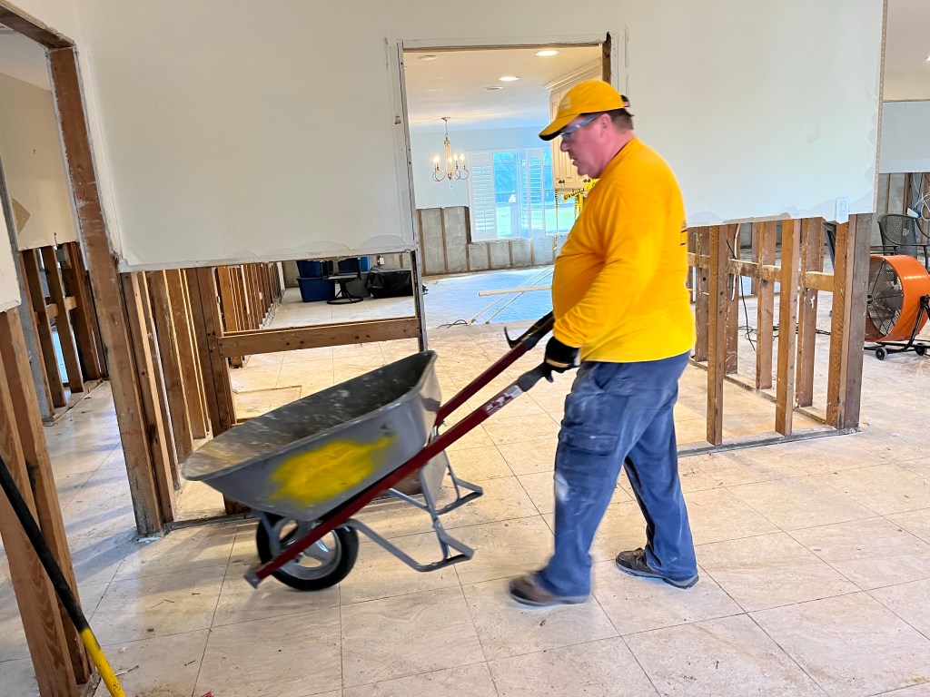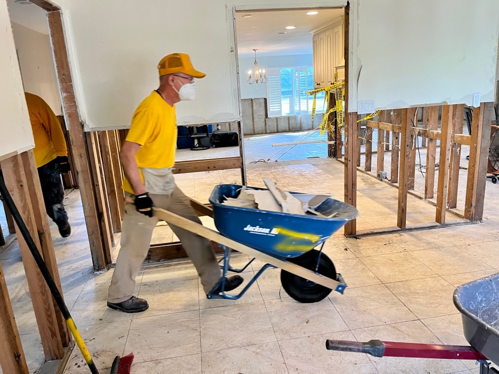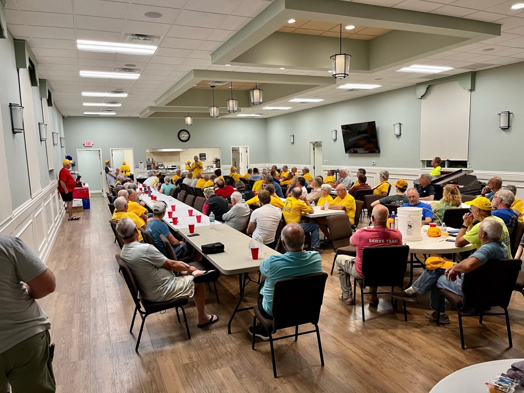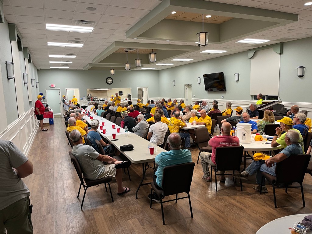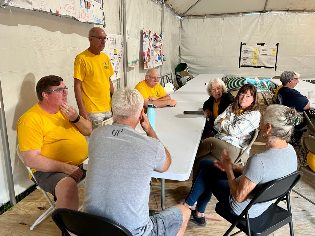 This is Laura, she has worked laundry and mud out for two different teams. She leaves for Arizona tomorrow…Wheel barrows go out, this is Bob, our new Blue Hat…Wheel barrows come in, this is Terry on his first call out. I liked him the moment I met him..This is Kathy, we have worked together before. I like her…This is Fran, we have worked together more than a few times. I like her too…This is Mark on his first call out. He is really a hard worker, and fun guy…Evening debrief…
