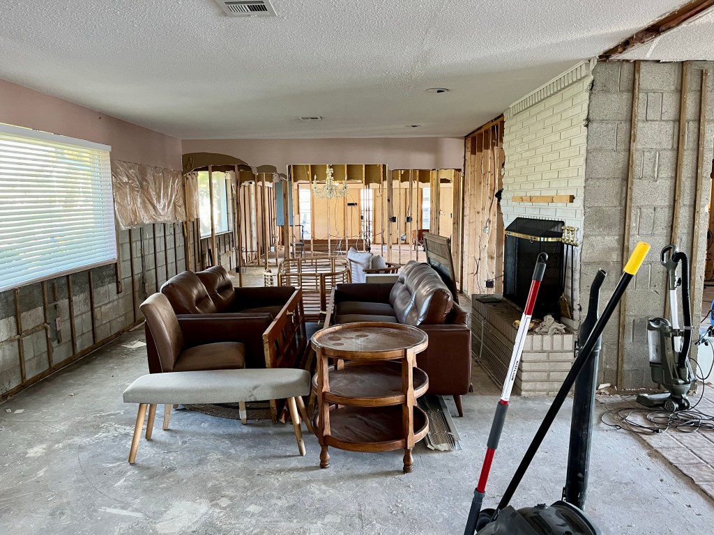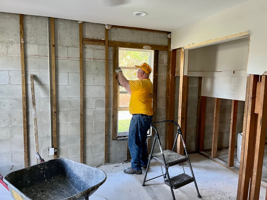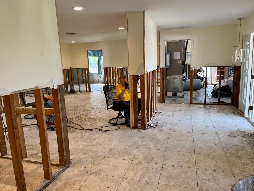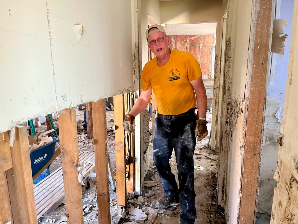 We had to climb down to work this site. On the left is Steve from Missouri DR, Rebecca, a volunteer from Reclamation Church, and property owner Dave…David and Norm working the garage area…