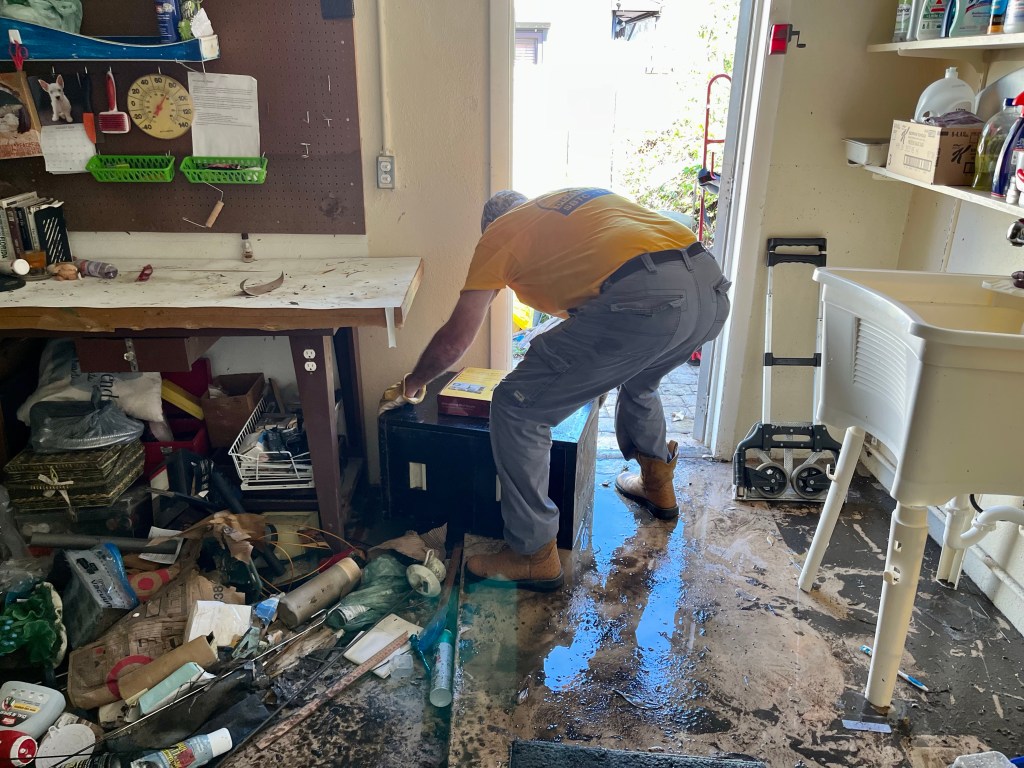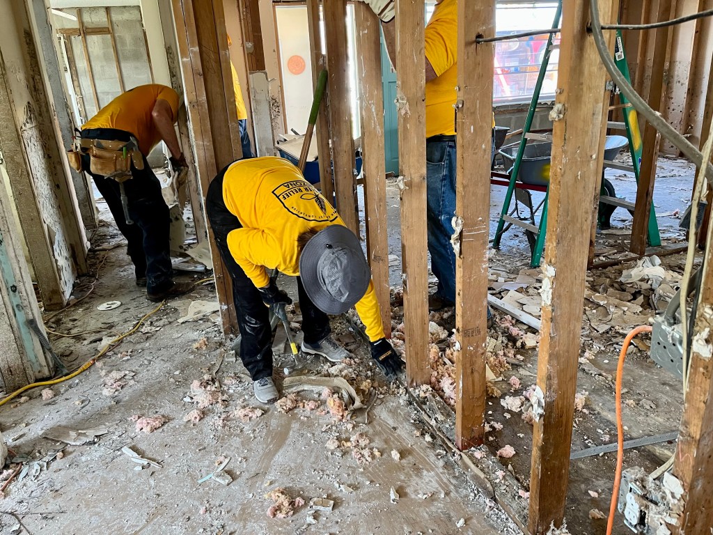 Great time worshiping this morning..Even though it is Sunday, the mold never rests. Yesterday I picked up our mud-out team and today after service we hit the ground running. Joining a Texas team that started this house two days ago we all got after it…Bob working in a closet…Fran working in what used to be the kitchen…Kathy pulling nails…Mark and a fella from the Texas team cleared this entire garage and removed the damaged overhead door…We are running out of space for debris!!!